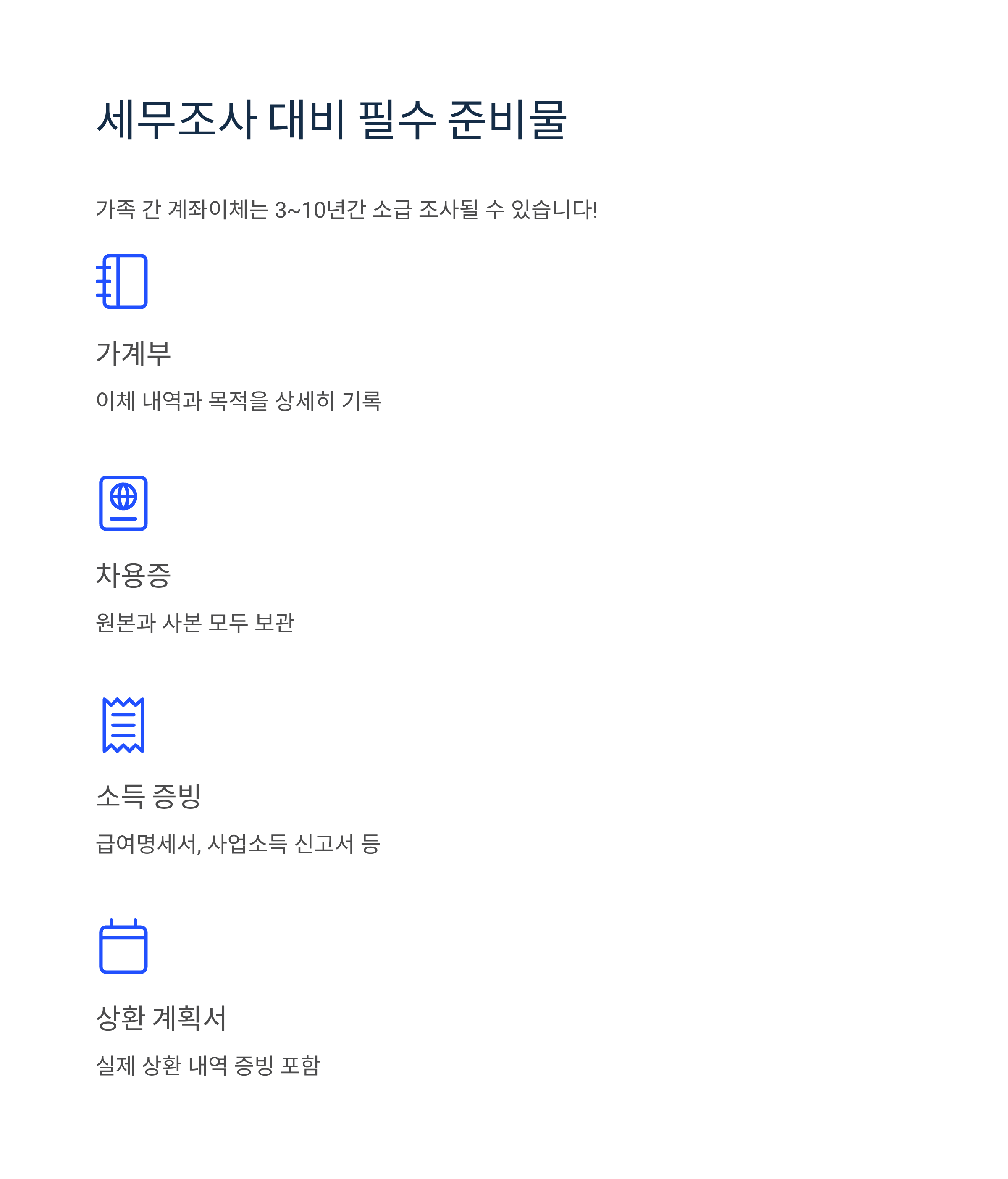 가족 간 계좌이체는 부동산 취득이나 상속 시 3~10년간 소급 조사되므로, 다음 서류를 체계적으로 보관해야 합니다: