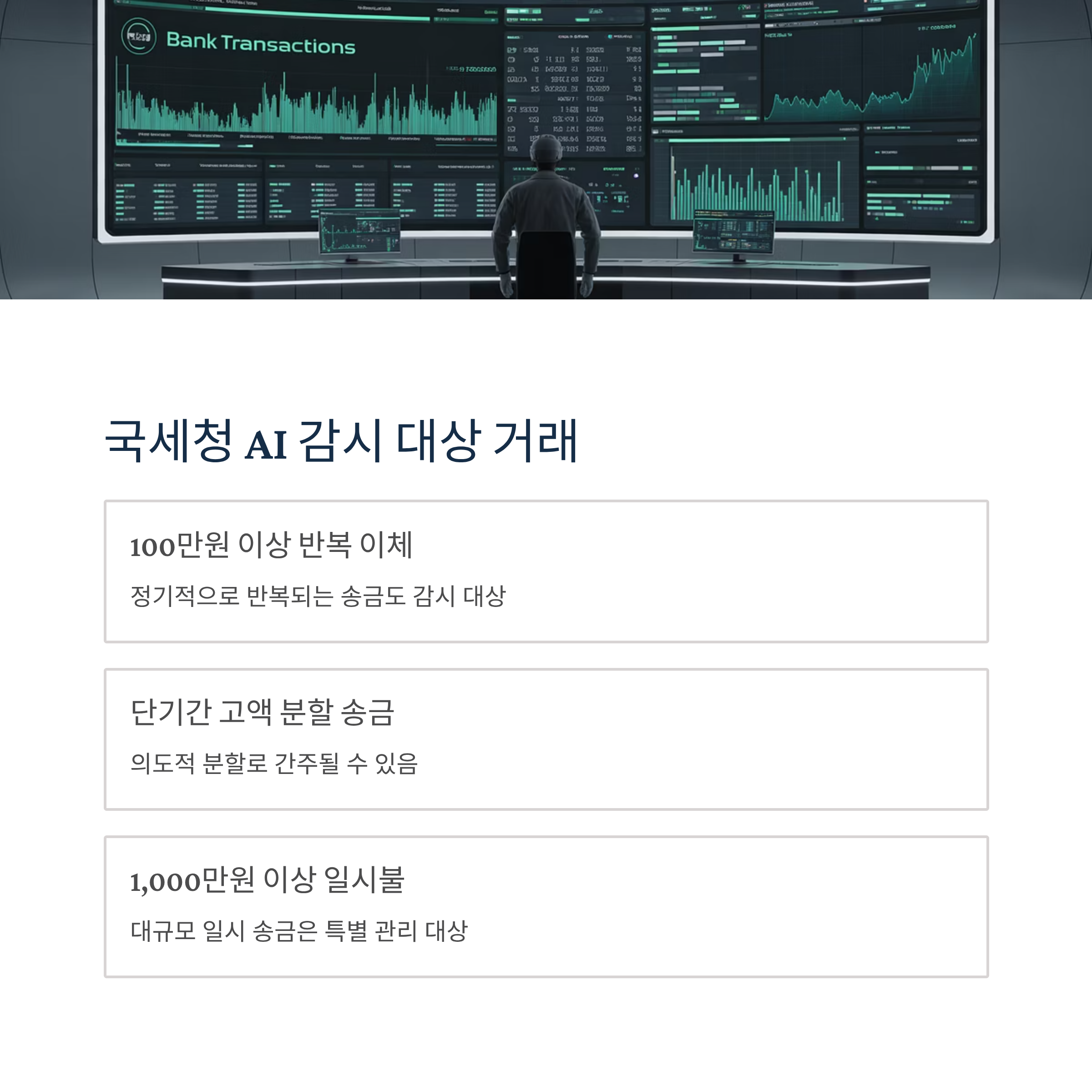 현재 국세청은 AI와 빅데이터를 활용한 거래 모니터링 시스템을 운영하고 있으며, 다음과 같은 거래가 주요 감시 대상이 됩니다: