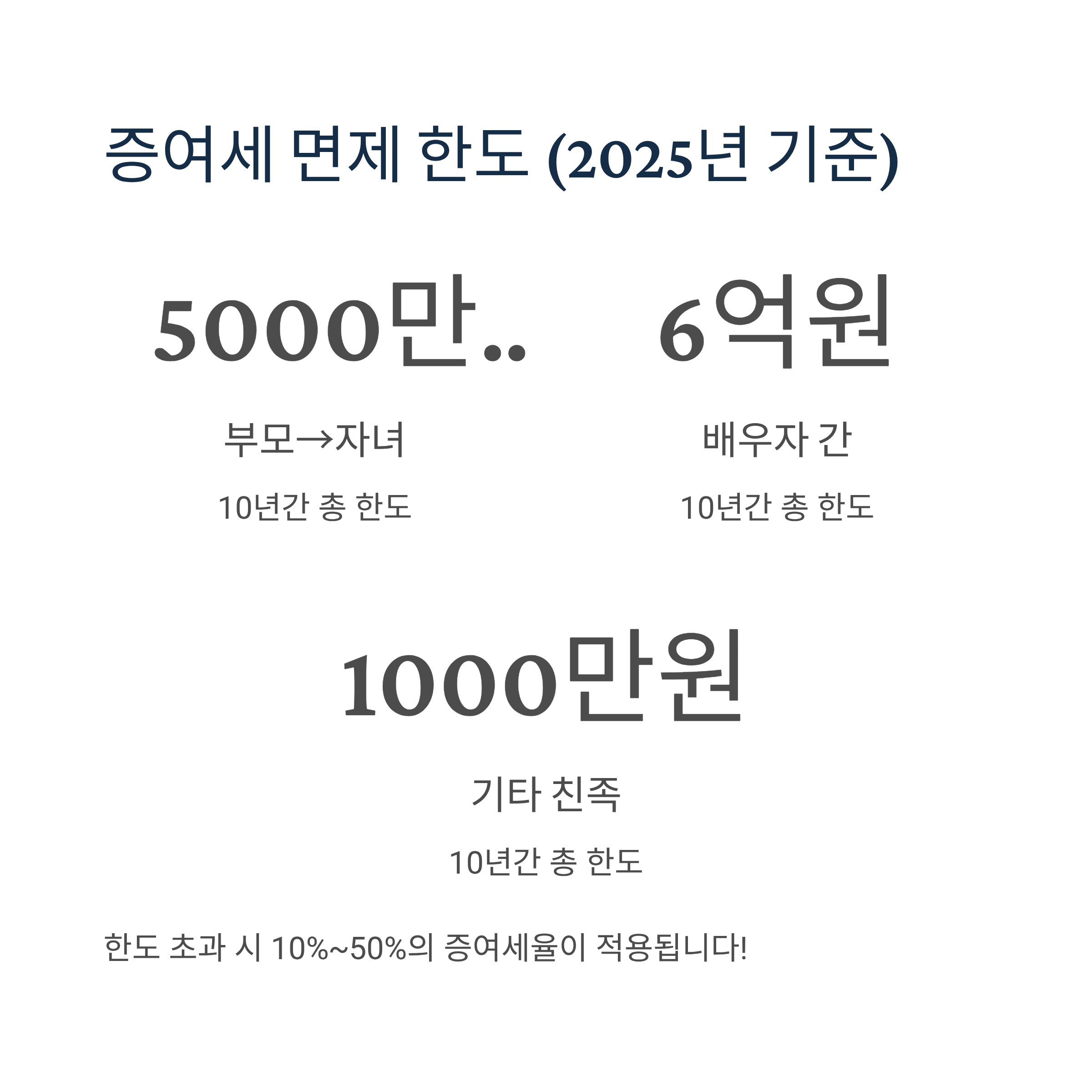 이 한도를 초과하면 10%~50%의 높은 증여세율이 적용되므로, 누적 금액을 반드시 체크해야 합니다.