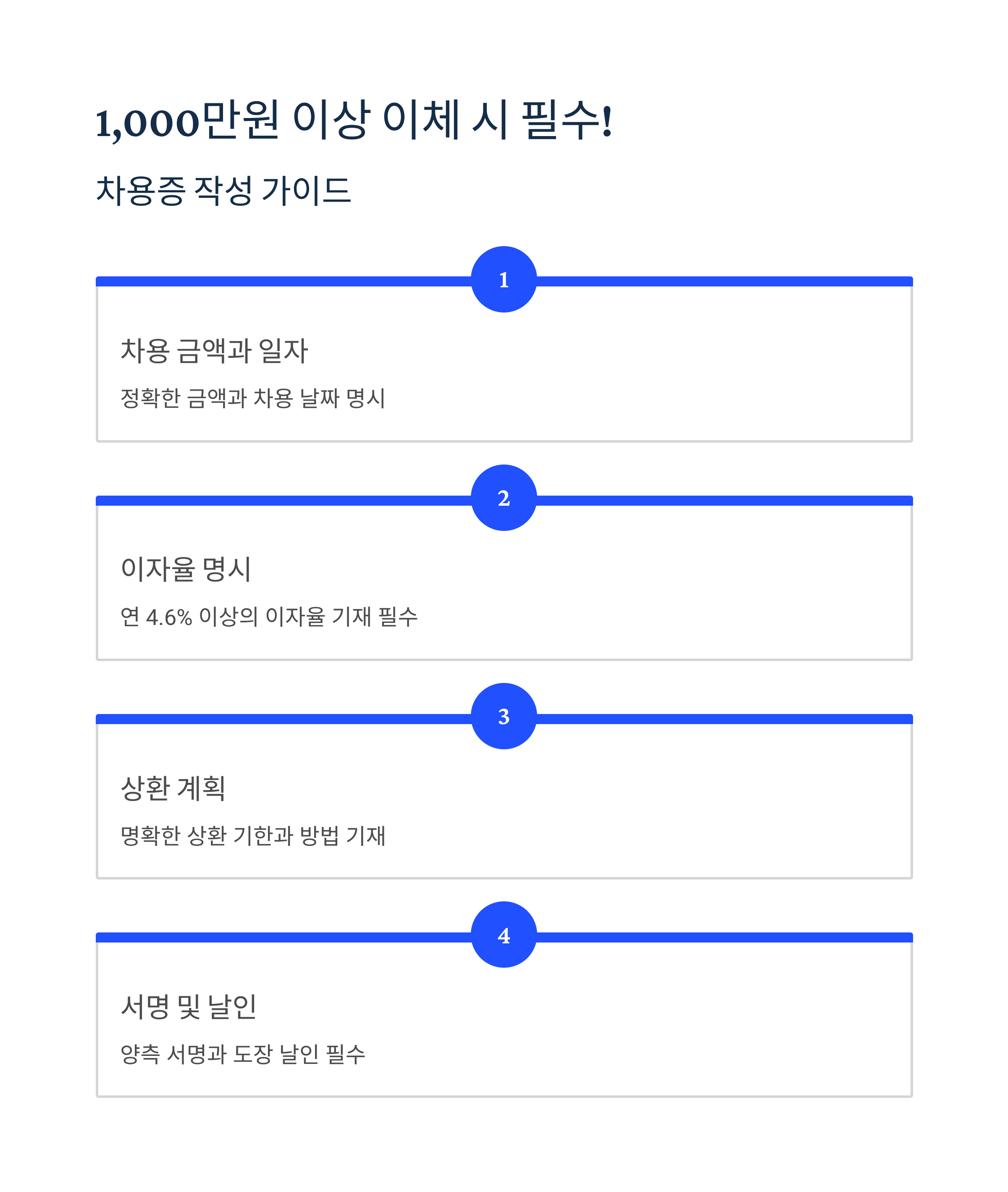 큰 금액을 이체할 때는 단순 증여가 아닌 '대여'임을 입증할 수 있는 차용증 작성이 필수입니다. 차용증에는 다음 내용이 반드시 포함되어야 합니다: