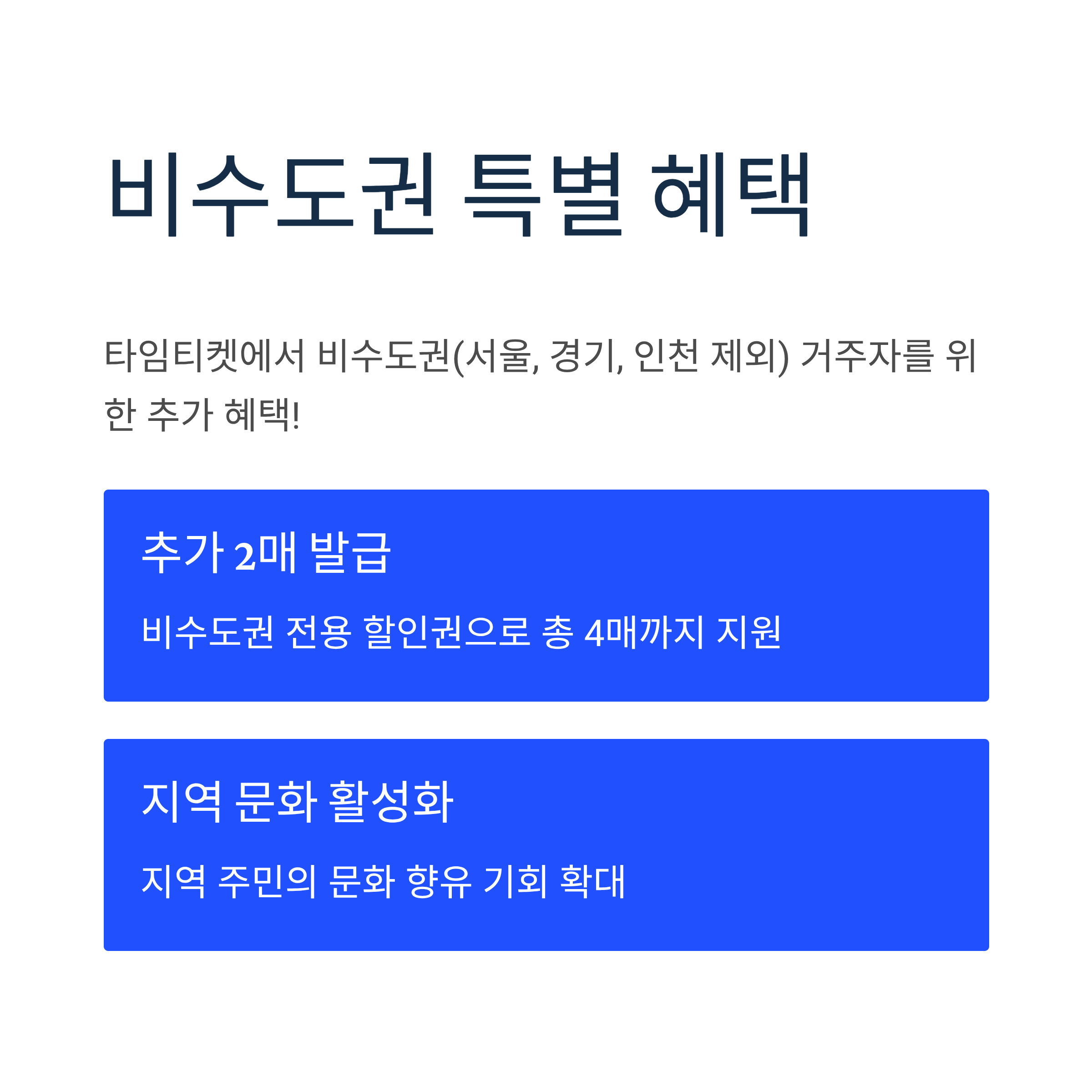 - 추가 혜택: 타임티켓에서 비수도권 전용 할인권 추가 2매 발급 (총 4매 지원)