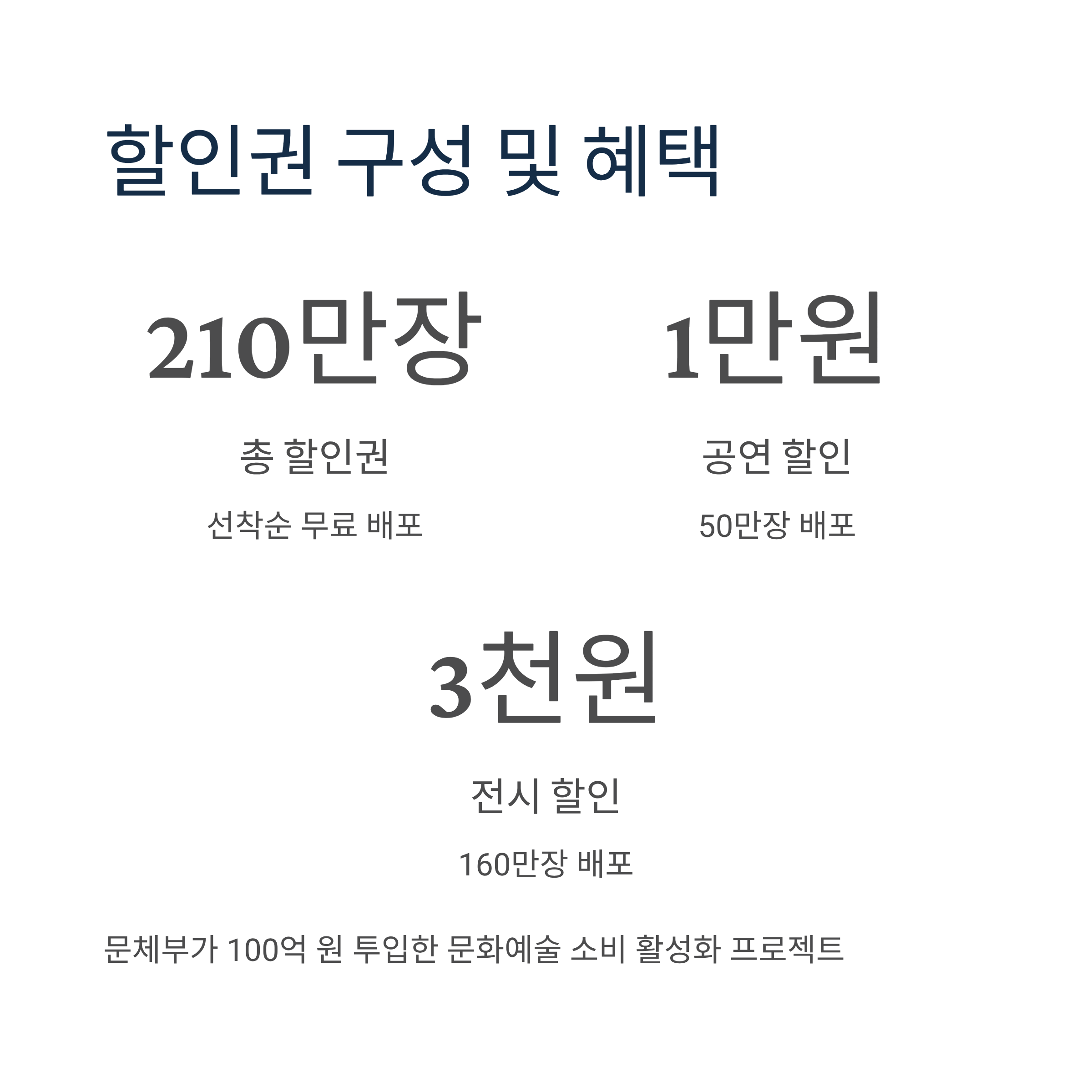 문화체육관광부는 예술경영지원센터, 한국문화예술위원회와 함께 민생 회복을 위한 2차 추가경정예산 100억 원을 투입하여 이번 할인권 사업을 추진합니다.