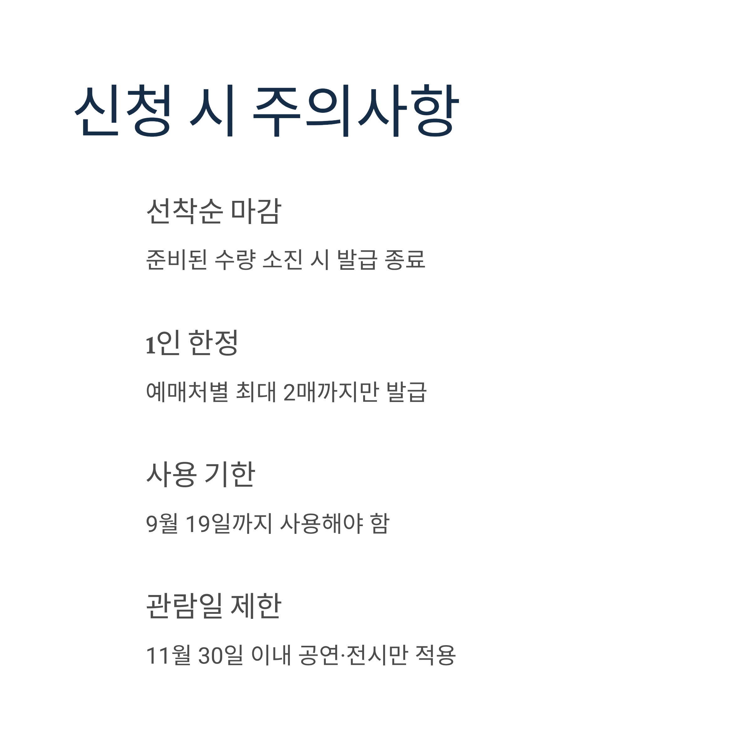 - 관람 기한: 11월 30일 이내 예정 공연·전시에 한함