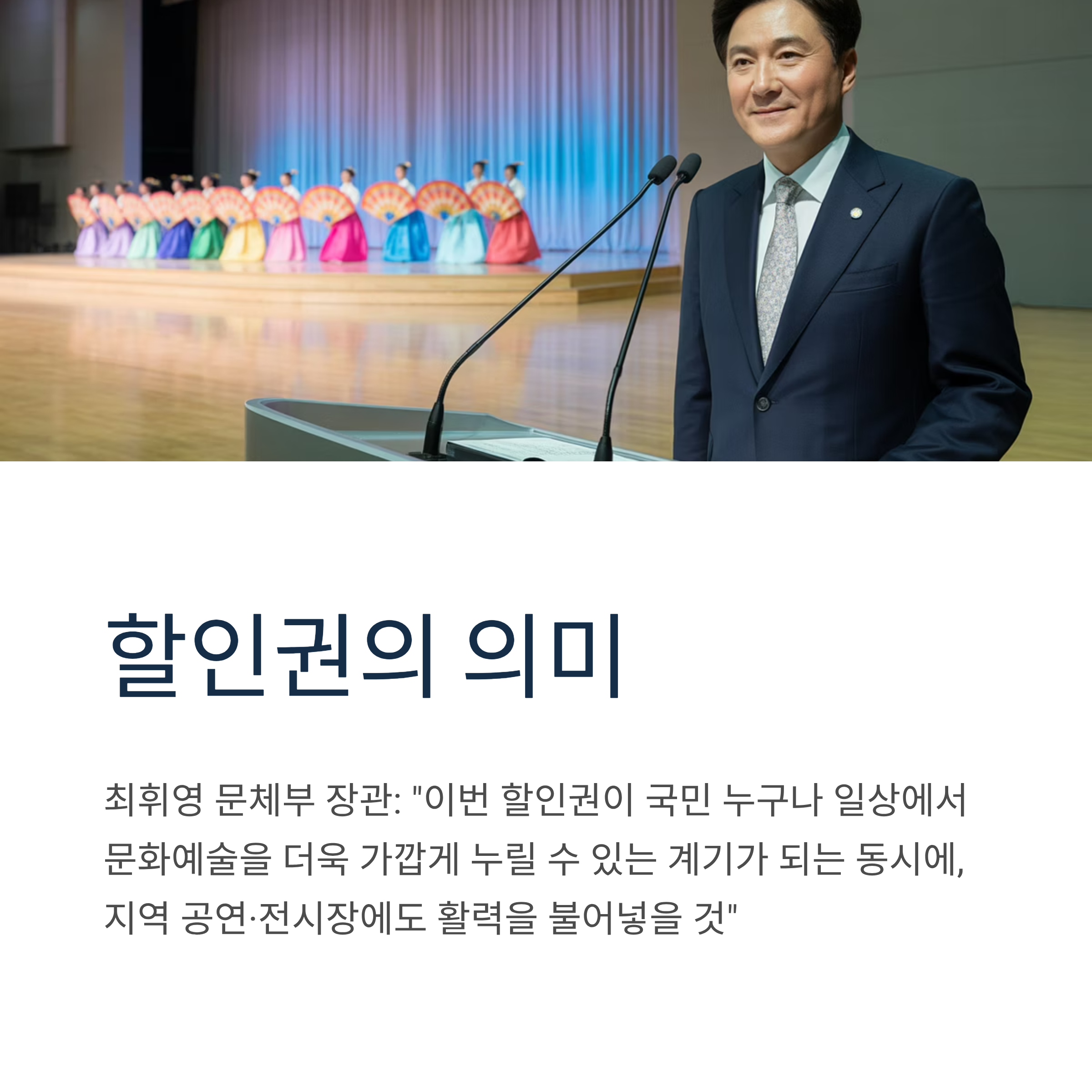최휘영 문체부 장관은 "이번 할인권이 국민 누구나 일상에서 문화예술을 더욱 가깝게 누릴 수 있는 계기가 되는 동시에, 지역 공연·전시장에도 활력을 불어넣을 것"이라고 기대감을 표했습니다.