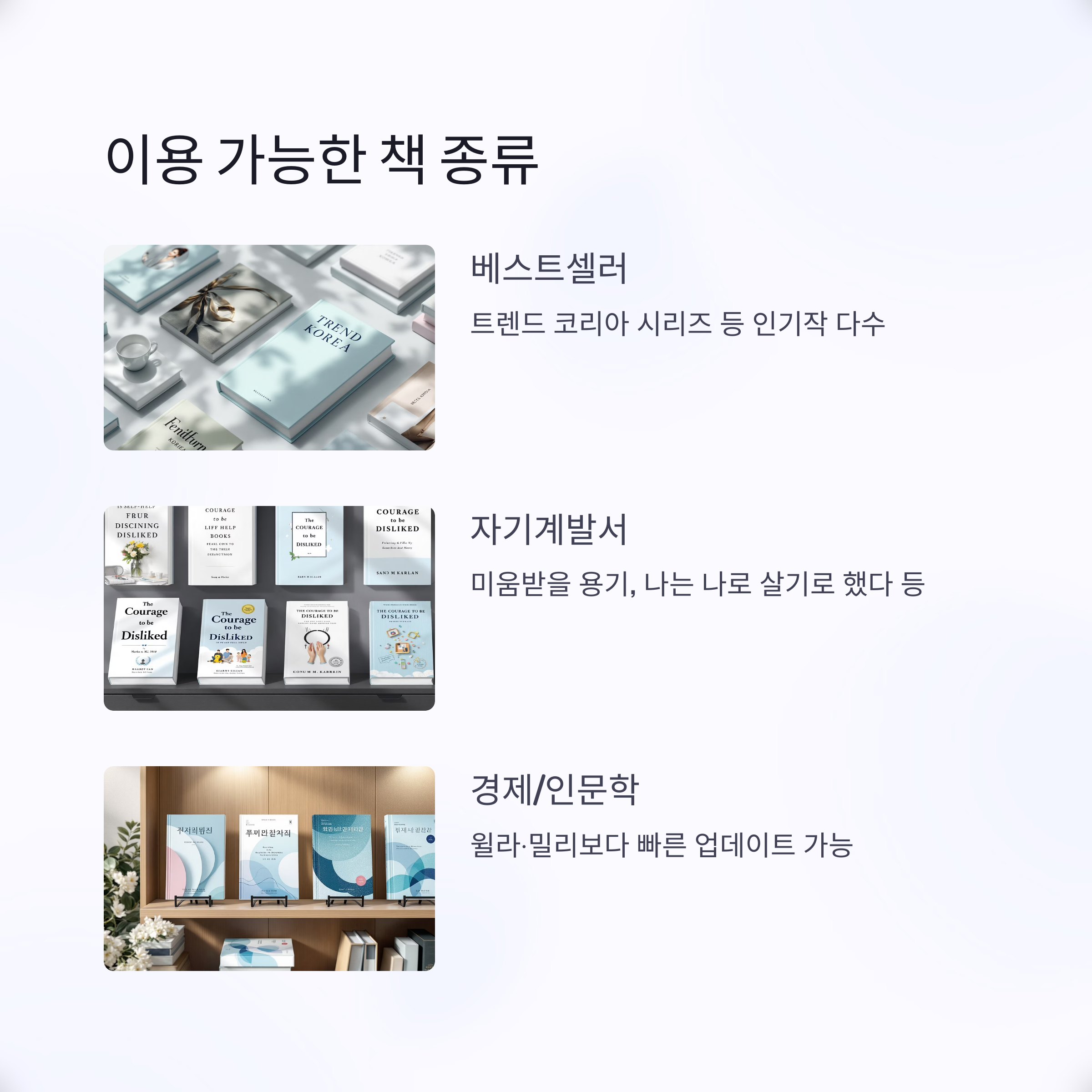 일부 최신 신간도 빠르게 제공되는 경우가 많아요.