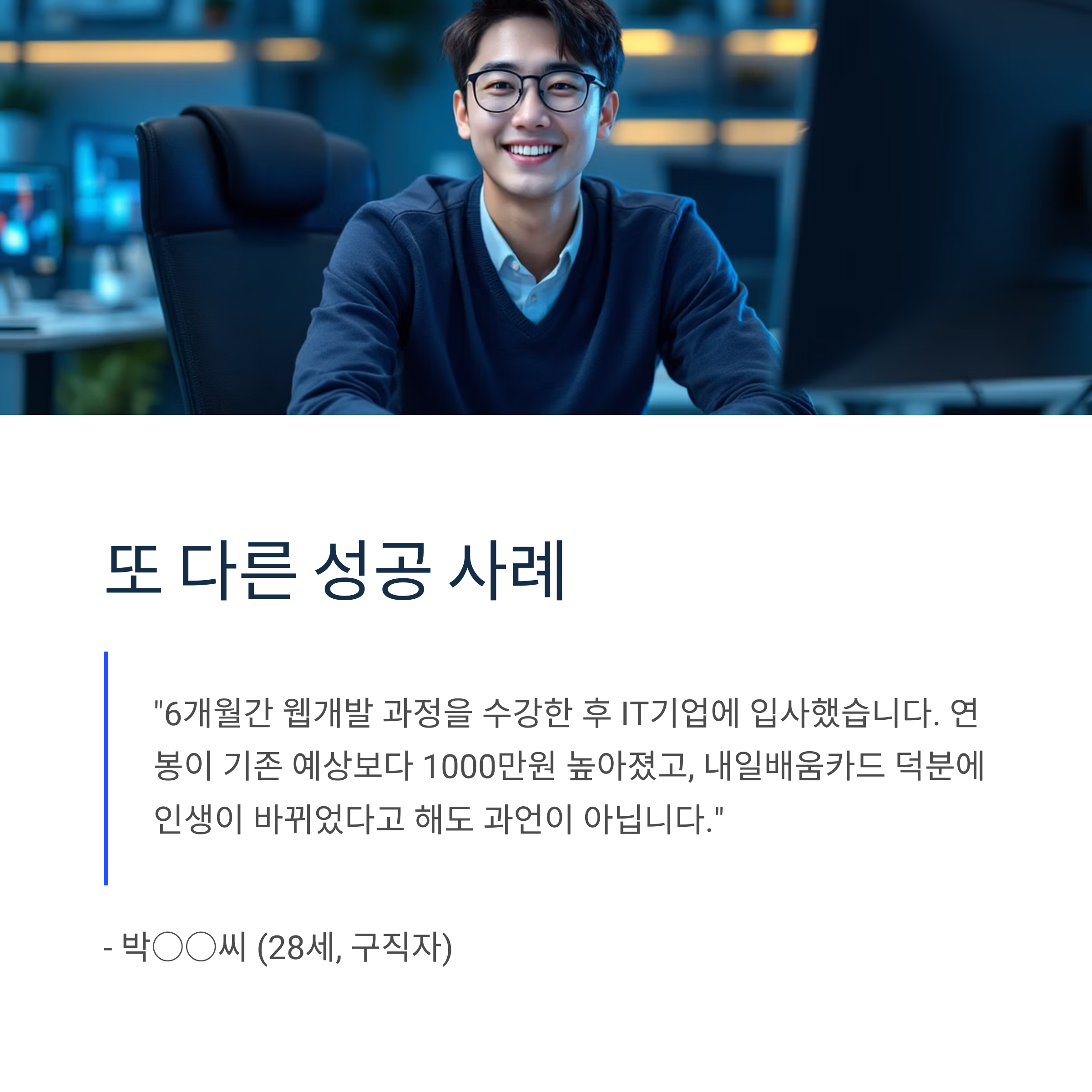 "6개월간 웹개발 과정을 수강한 후 IT기업에 입사했습니다. 연봉이 기존 예상보다 1000만원 높아졌고, 내일배움카드 덕분에 인생이 바뀌었다고 해도 과언이 아닙니다."