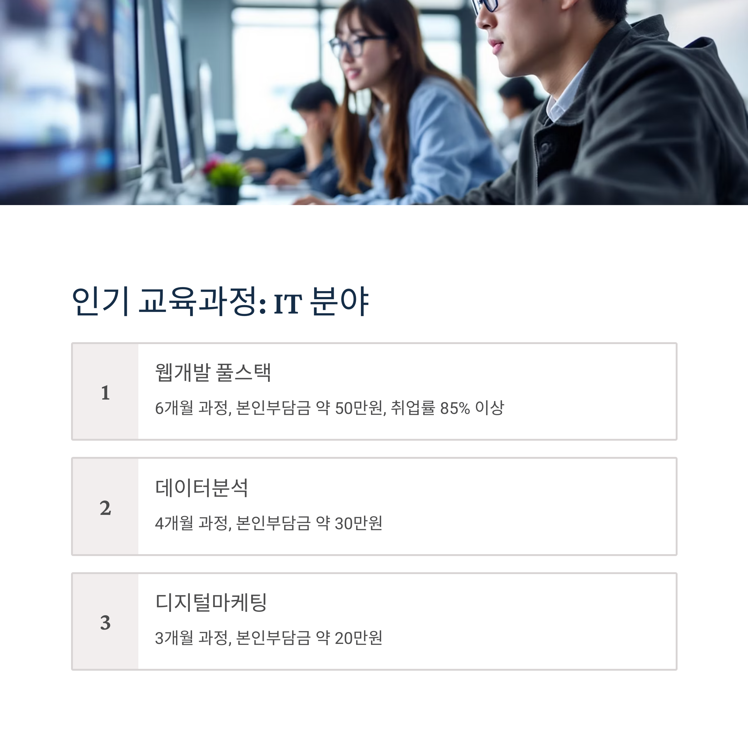 - 디지털마케팅 실무 과정 (3개월, 본인부담금 약 20만원)