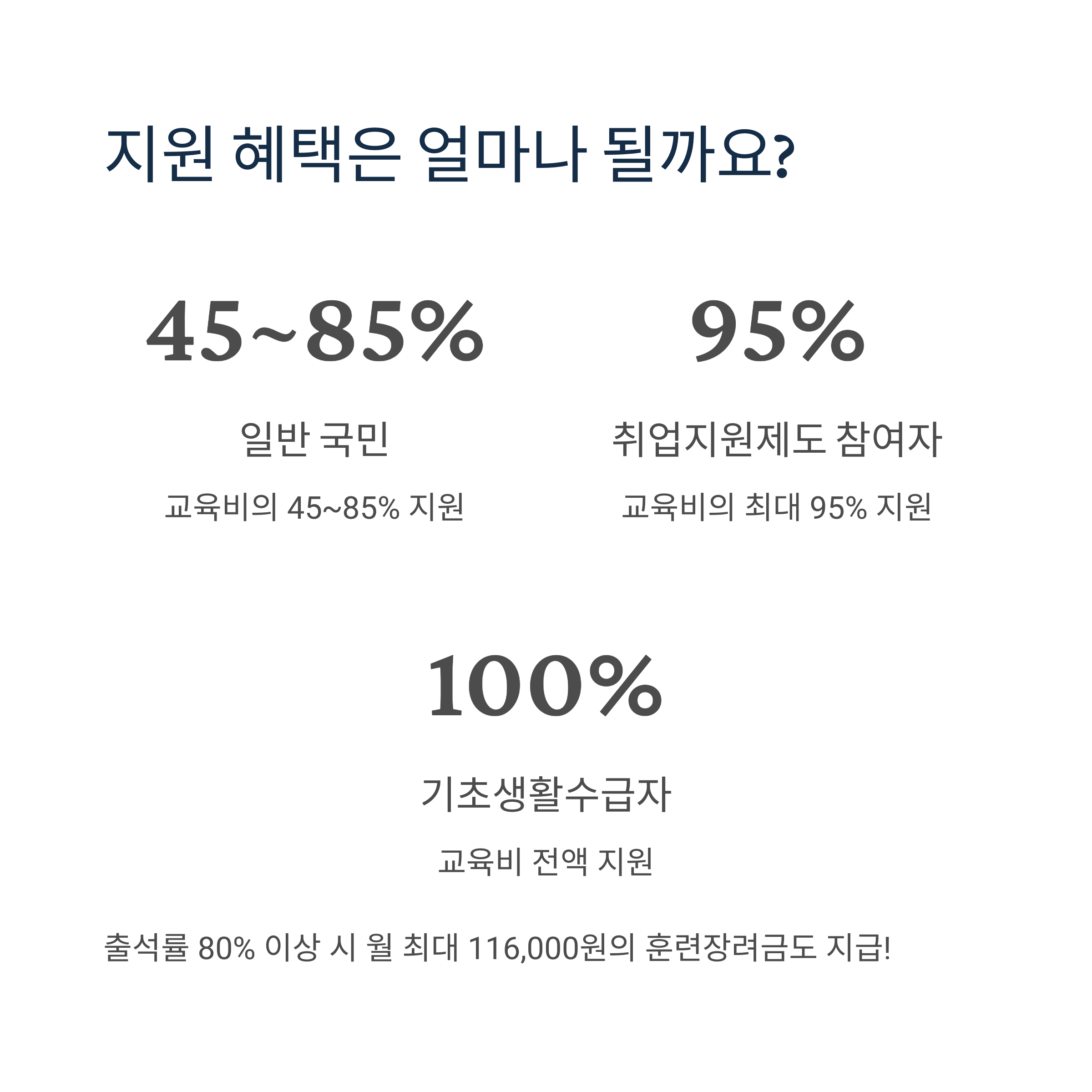 - 훈련장려금: 월 최대 116,000원 (출석률 80% 이상 시)