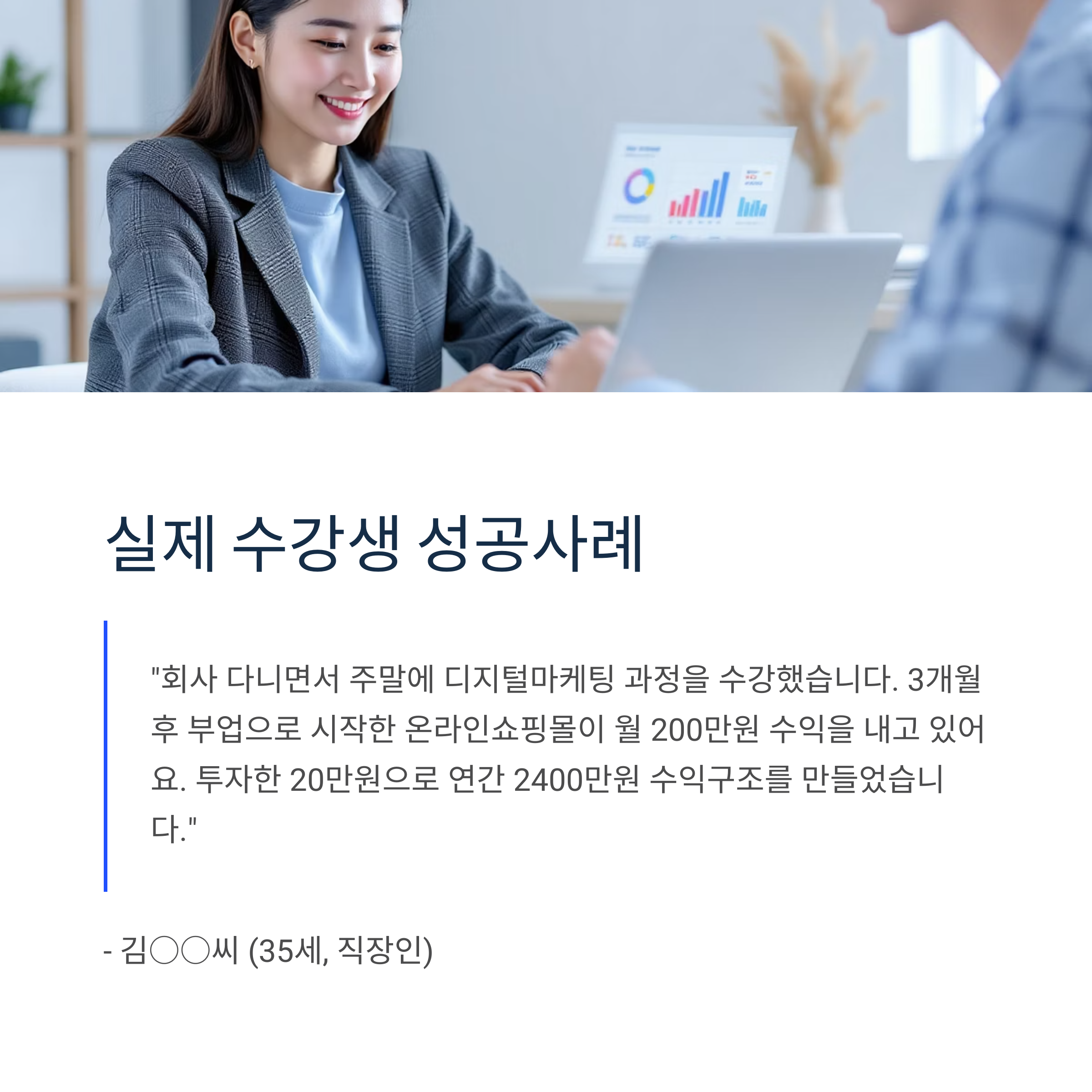 "회사 다니면서 주말에 디지털마케팅 과정을 수강했습니다. 3개월 후 부업으로 시작한 온라인쇼핑몰이 월 200만원 수익을 내고 있어요. 투자한 20만원으로 연간 2400만원 수익구조를 만들었습니다."