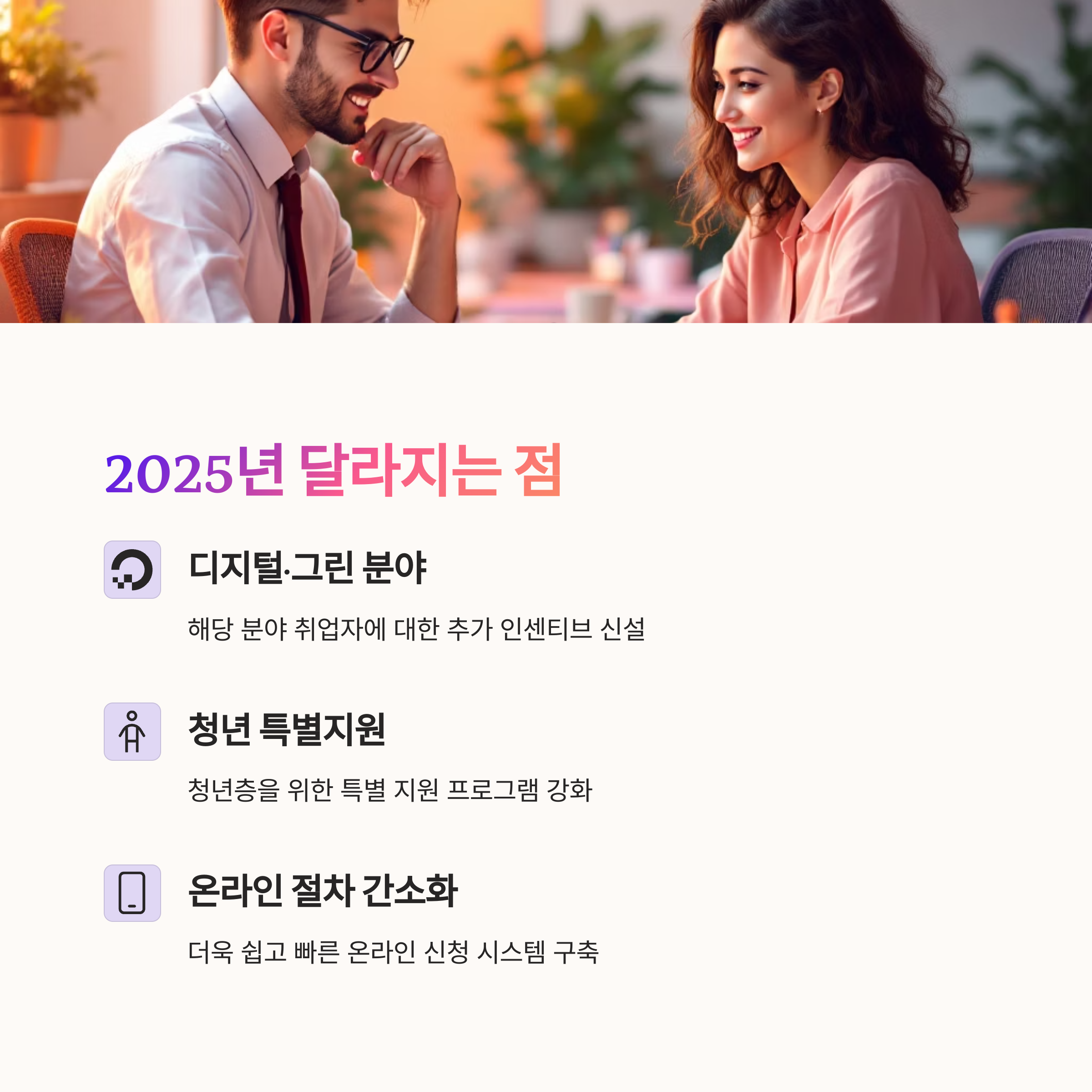 올해부터는 디지털·그린 분야 취업자에 대한 추가 인센티브가 신설되었으며, 청년 특별지원도 강화되었습니다. 또한 온라인 신청 절차가 더욱 간소화되어 접근성이 향상되었습니다.