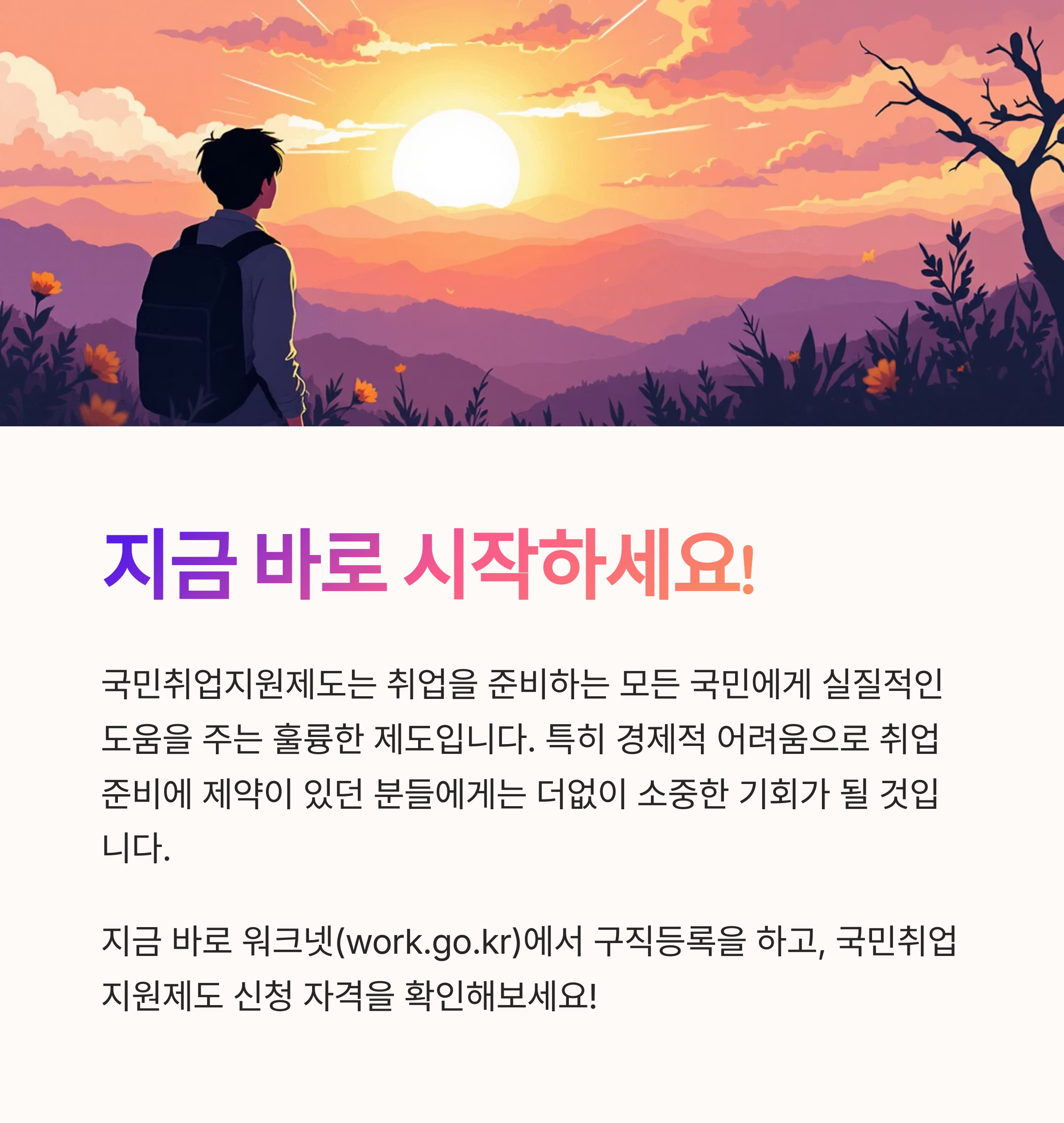 지금 바로 워크넷에서 구직등록을 하고, 국민취업지원제도 신청 자격을 확인해보세요. 여러분의 성공적인 취업을 위한 첫걸음이 될 것입니다.
