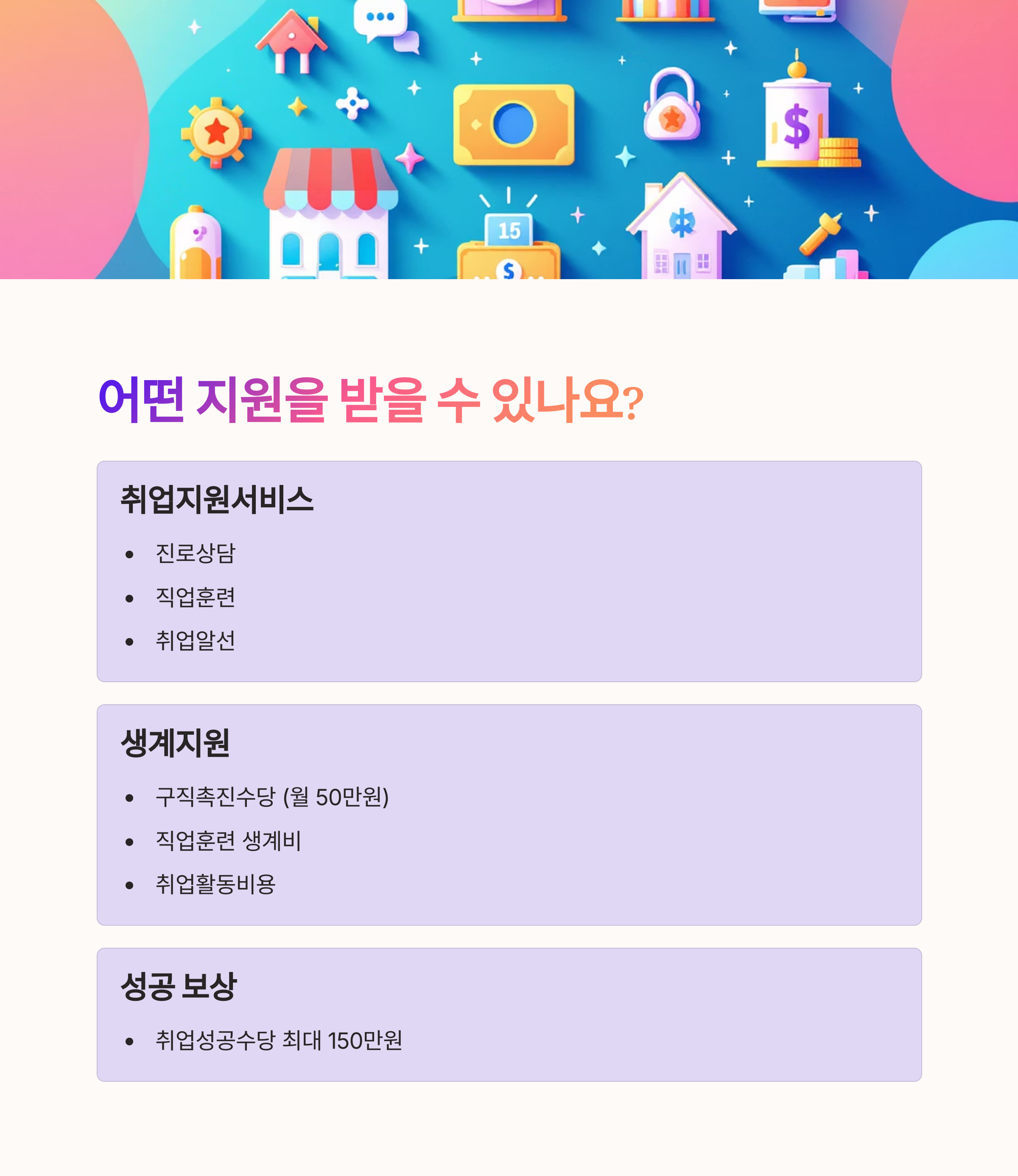 - 취업성공수당: 취업 시 최대 150만원