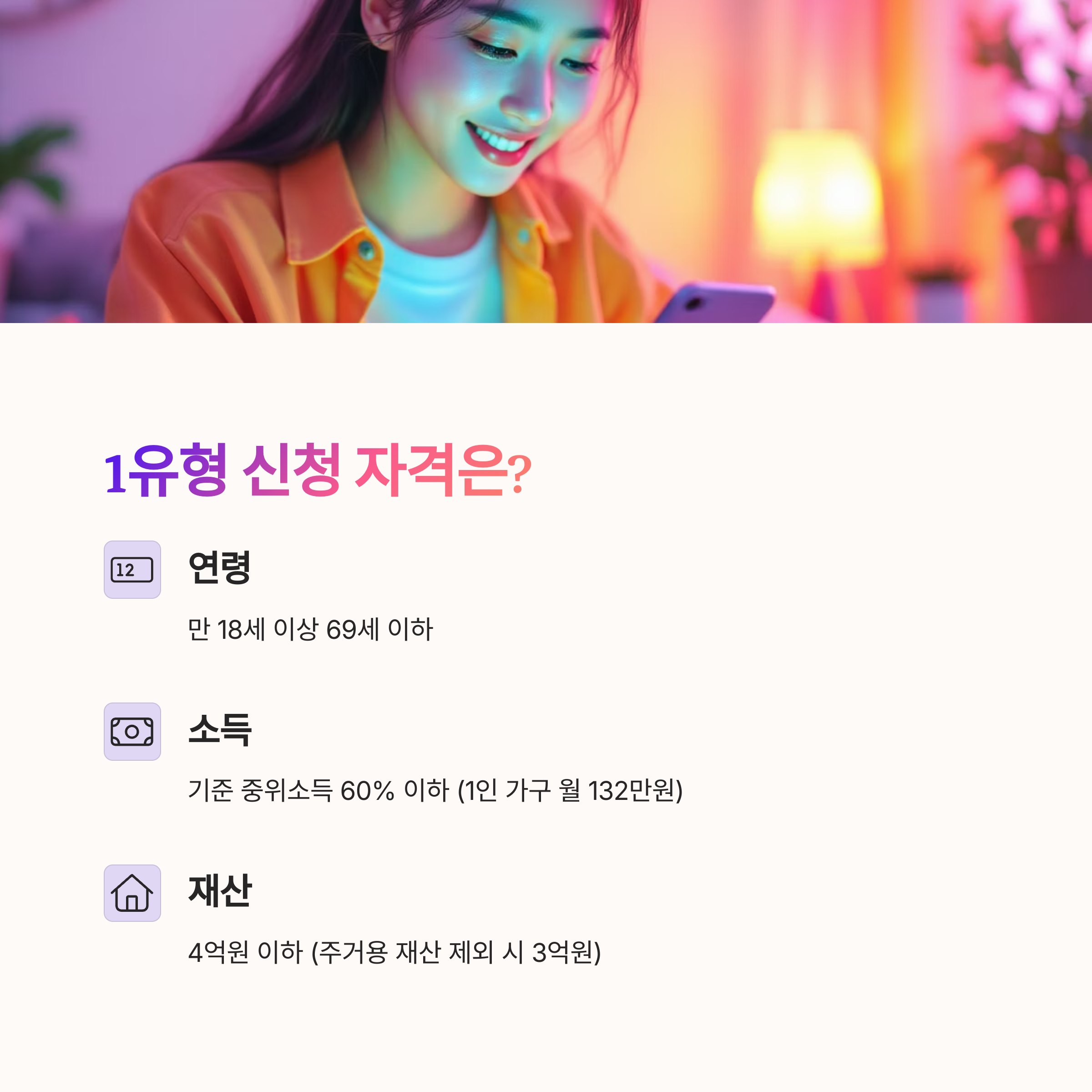 - 소득: 기준 중위소득 60% 이하 (1인 가구 월 132만원)