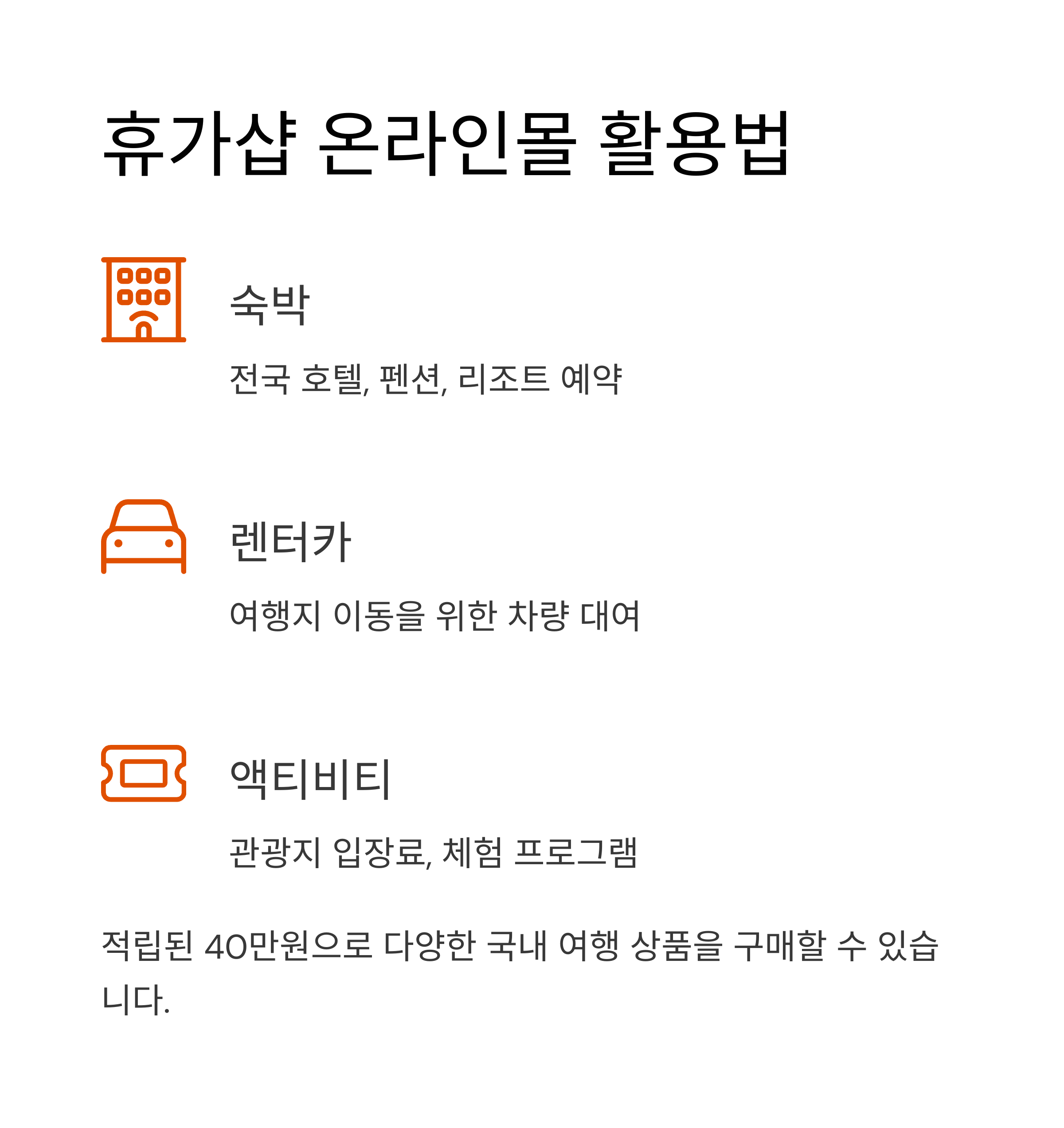 적립된 40만원은 휴가샵 온라인몰에서 국내 여행 상품 구매 시 사용 가능합니다. 숙박, 렌터카, 액티비티, 관광지 입장료 등 다양한 국내 여행 관련 상품을 구매할 수 있어 실질적인 여행비 절약 효과를 얻을 수 있습니다.