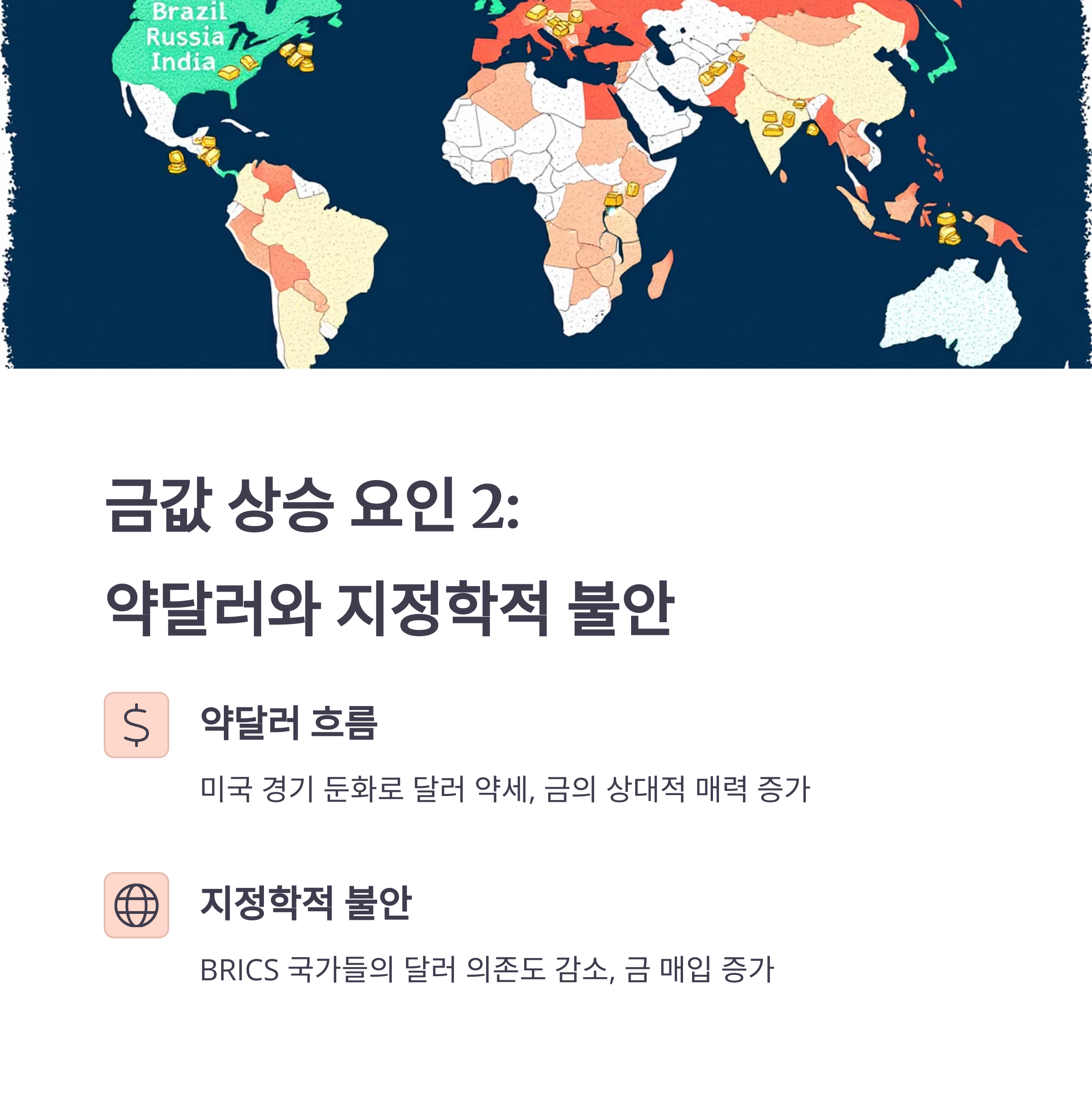 • BRICS 국가들이 달러 의존도를 줄이고 금을 대체자산으로 매입 중입니다.