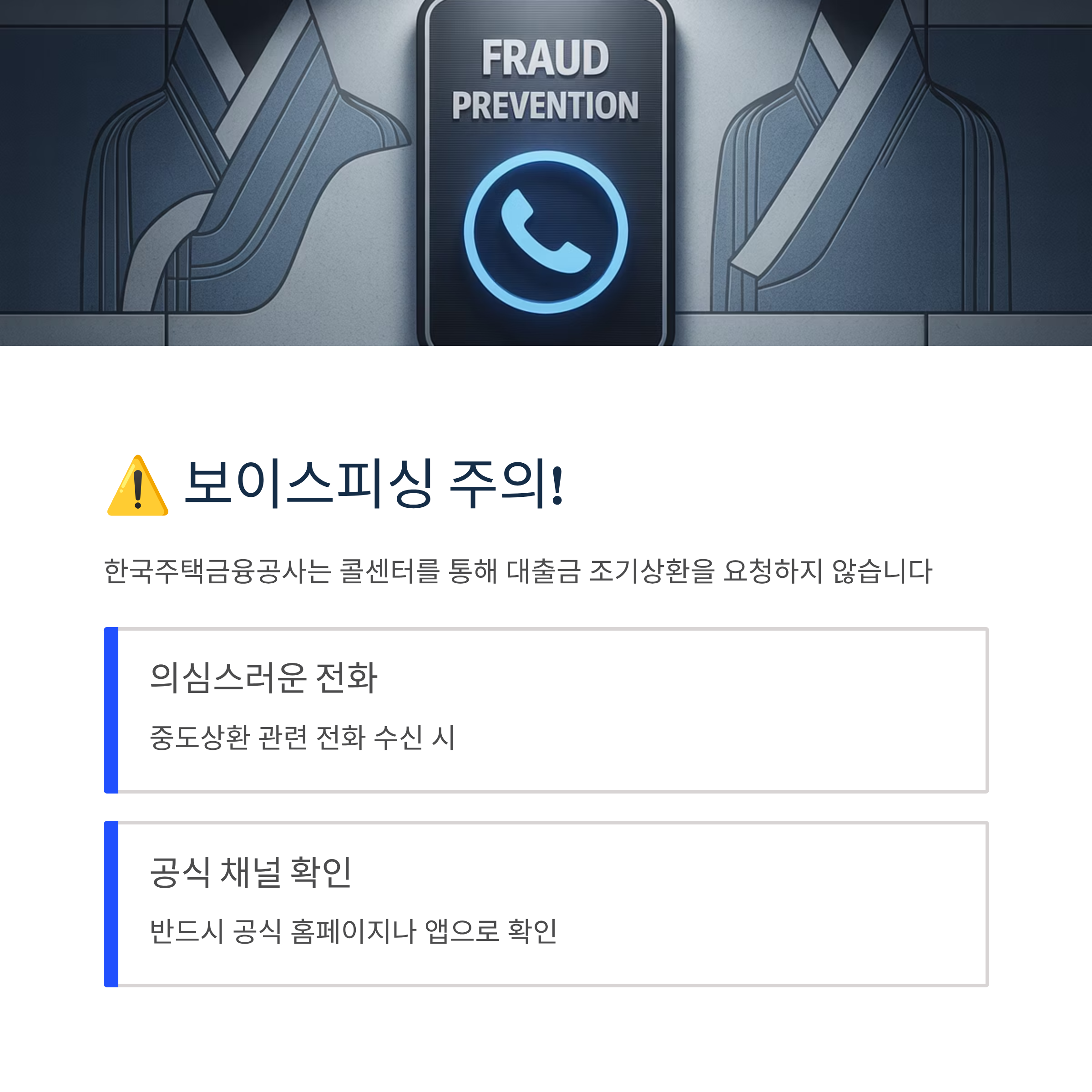 한국주택금융공사는 콜센터를 통해 대출금 조기상환을 요청하지 않습니다. 중도상환 관련 전화를 받으면 반드시 공식 채널을 통해 확인하시기 바랍니다.