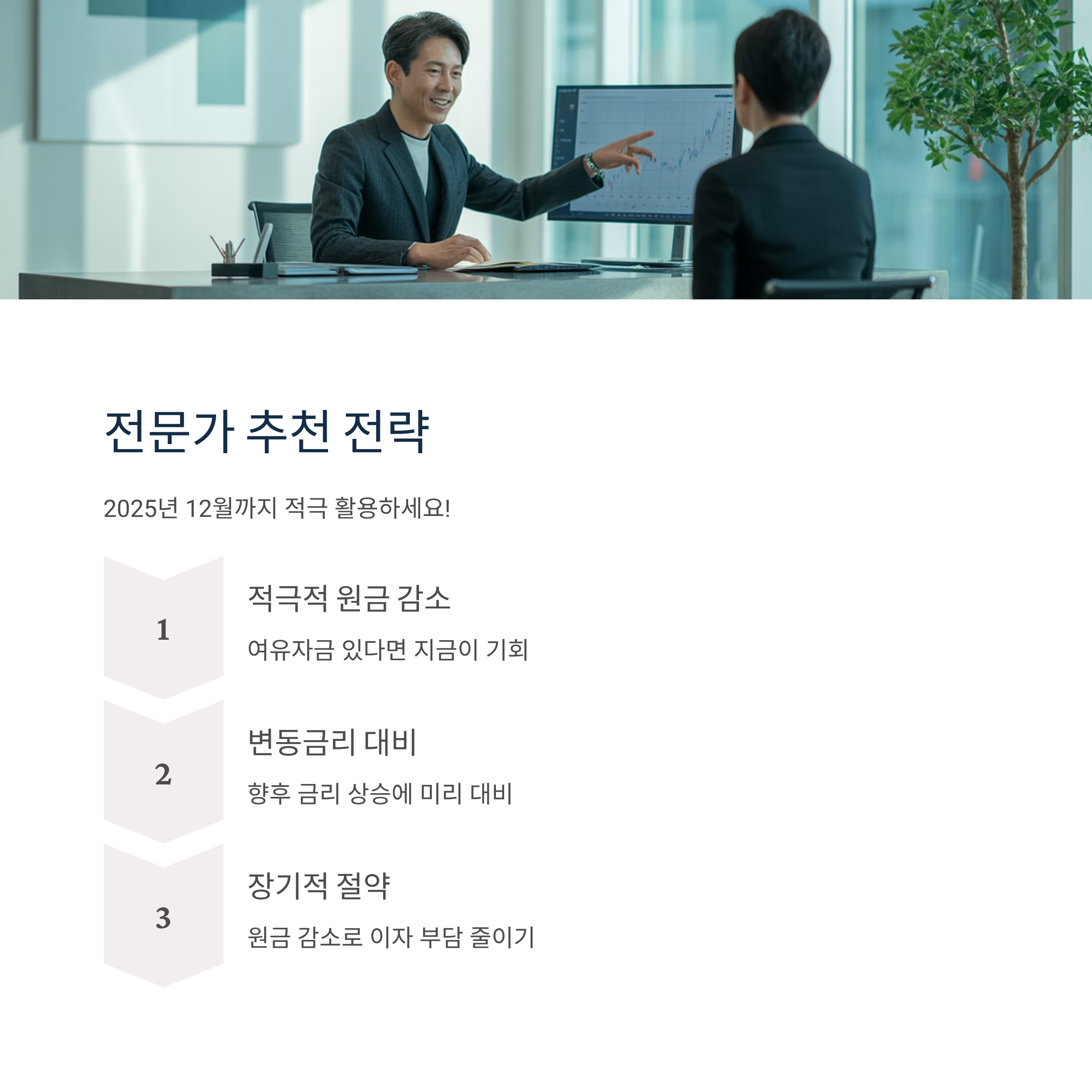 현재까지는 중도상환수수료가 면제되므로, 여유 자금이 있다면 적극적으로 원금을 줄이는 것을 추천합니다. 특히 변동금리 대출을 받은 경우, 향후 금리 상승에 대비해 미리 원금을 줄여두는 것이 유리합니다.