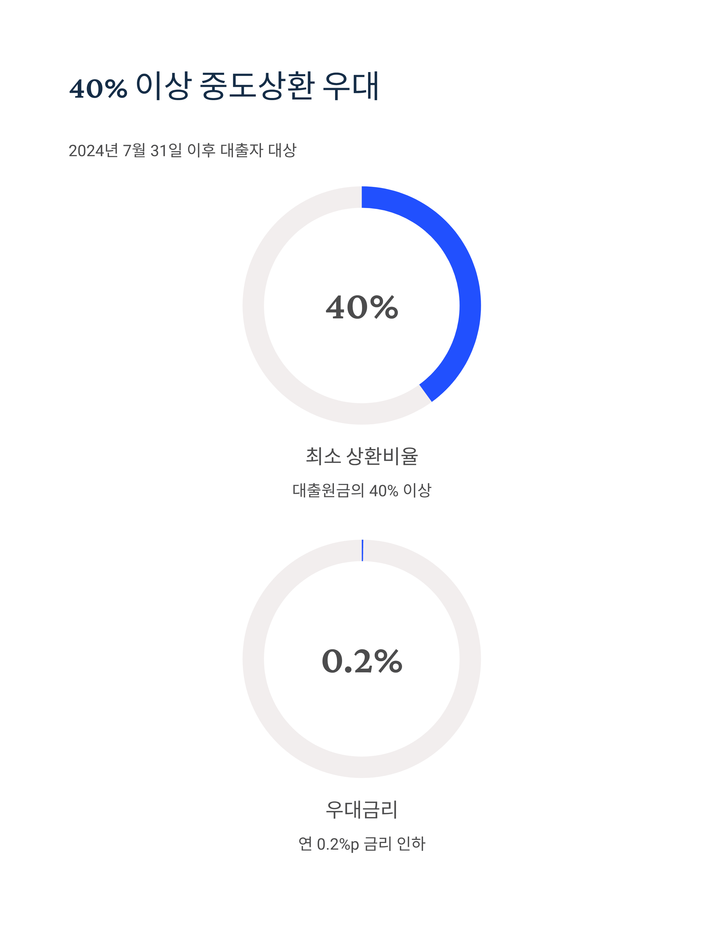 2024년 7월 31일 이후 대출 실행일로부터 1년 경과 후 대출원금의 40% 이상을 중도상환하는 경우, 수수료 면제는 아니지만 연 0.2%p의 우대금리가 적용됩니다.