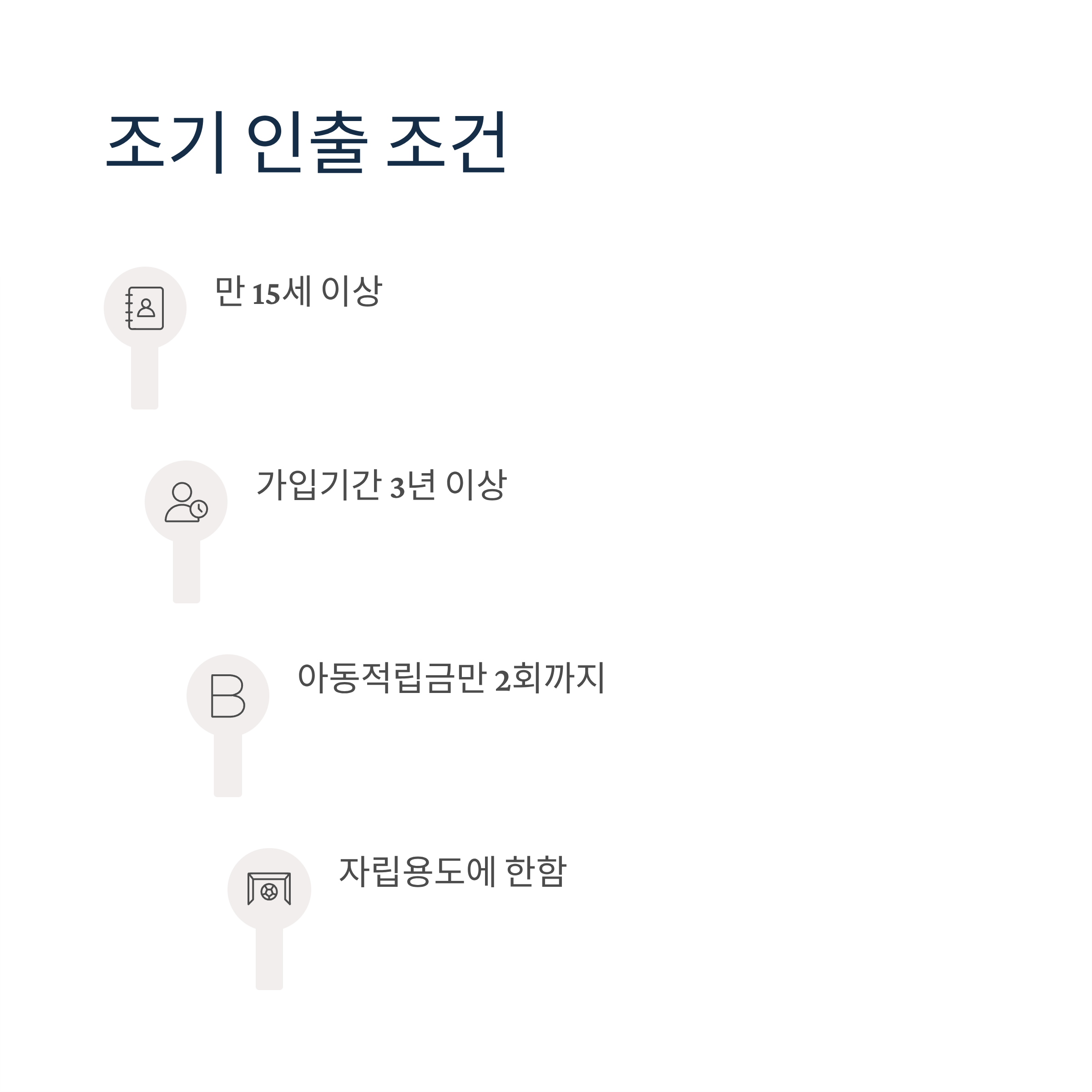 조기 인출: 만 15세 이상이며 가입기간 3년 이상인 경우, 자립용도에 한해 아동적립금만 2회까지 조기 인출 가능