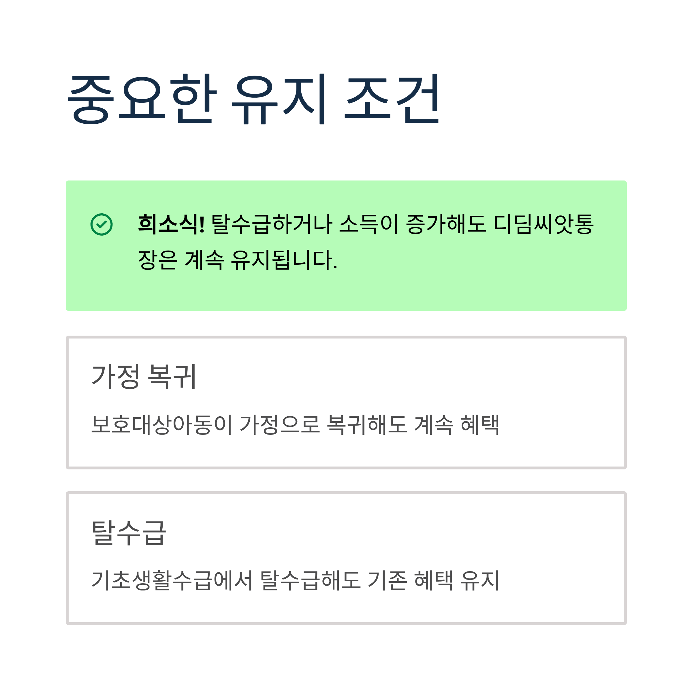기존 가입자들에게 희소식이 있습니다. 탈수급하거나 소득이 증가해도 디딤씨앗통장은 계속 유지됩니다. 가정 복귀한 보호대상아동이나 기초생활수급에서 탈수급한 가정의 아동도 기존 혜택을 그대로 받을 수 있습니다.
