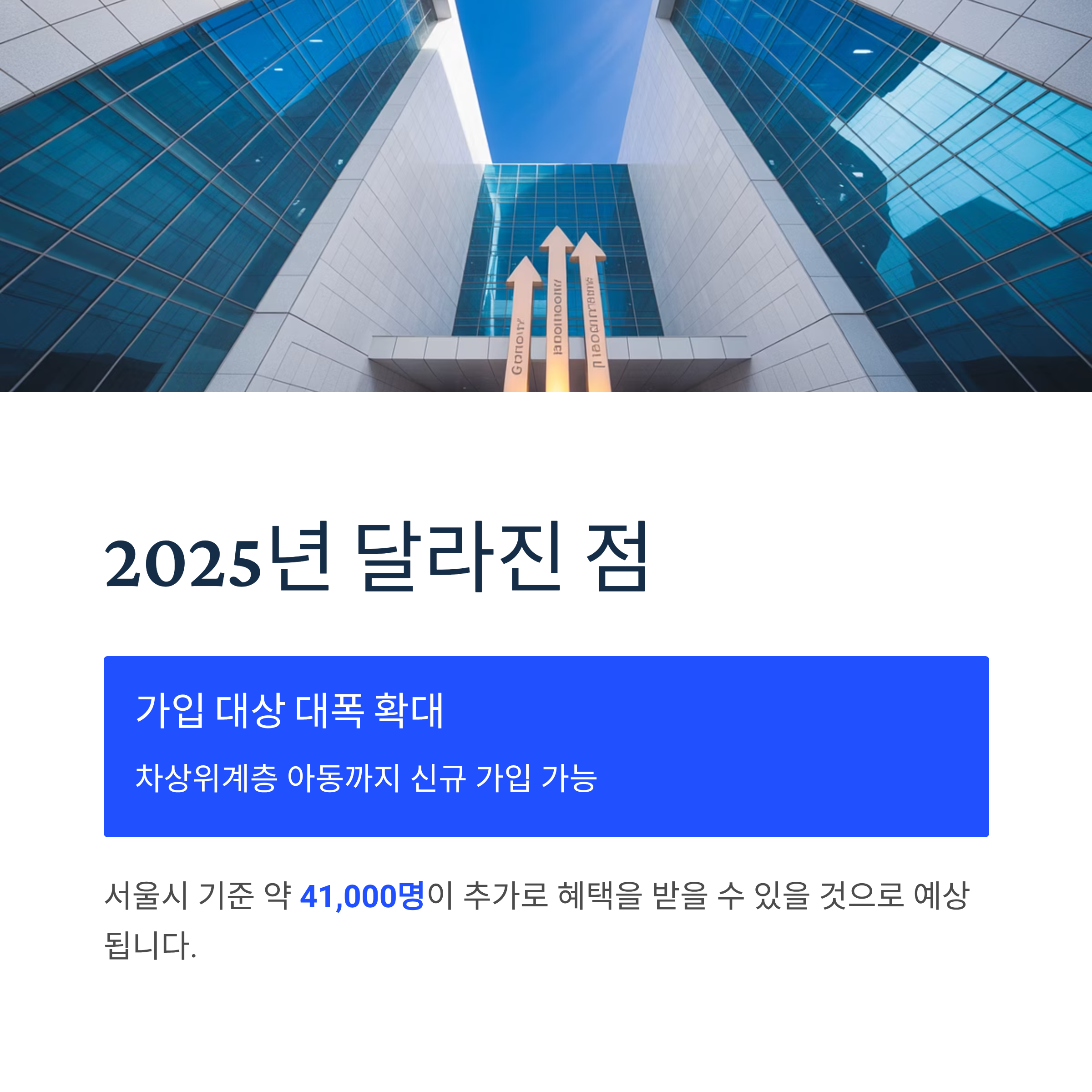 가입 대상 대폭 확대가 가장 큰 변화입니다. 기존에는 보호대상아동과 기초생활수급가구 아동만 신청 가능했으나, 2025년부터는 차상위계층 아동까지 신규 가입할 수 있게 되었습니다. 서울시 기준 약 41,000명이 추가로 혜택을 받을 수 있을 것으로 예상됩니다.