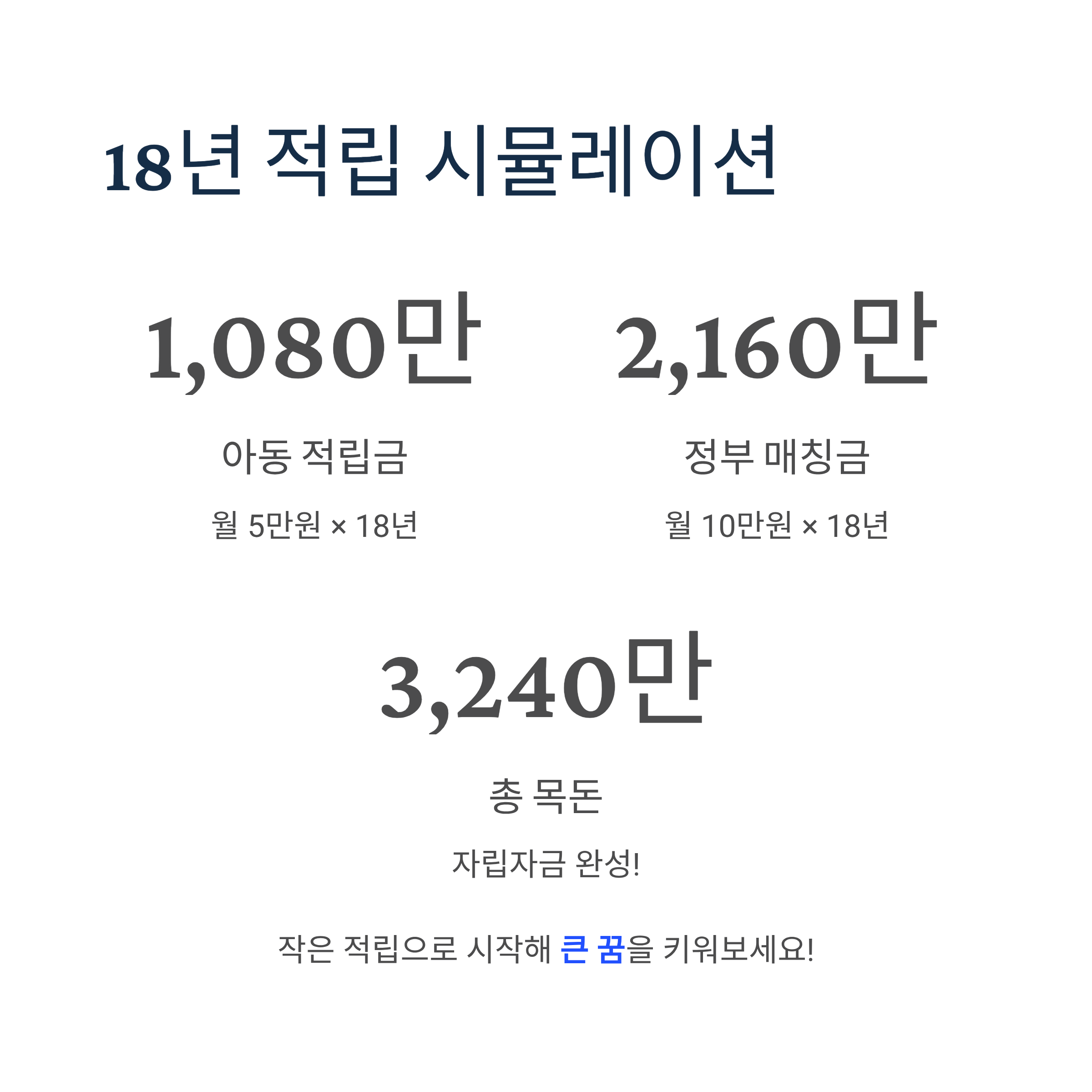 디딤씨앗통장의 핵심은 1:2 매칭 시스템입니다. 아동이 월 5만원을 적립하면 정부가 10만원을 매칭지원합니다. 예를 들어, 매월 5만원씩 18년간 총 1,080만원을 적립하면 정부 매칭금 2,160만원과 합쳐 총 3,240만원의 목돈을 마련할 수 있습니다.