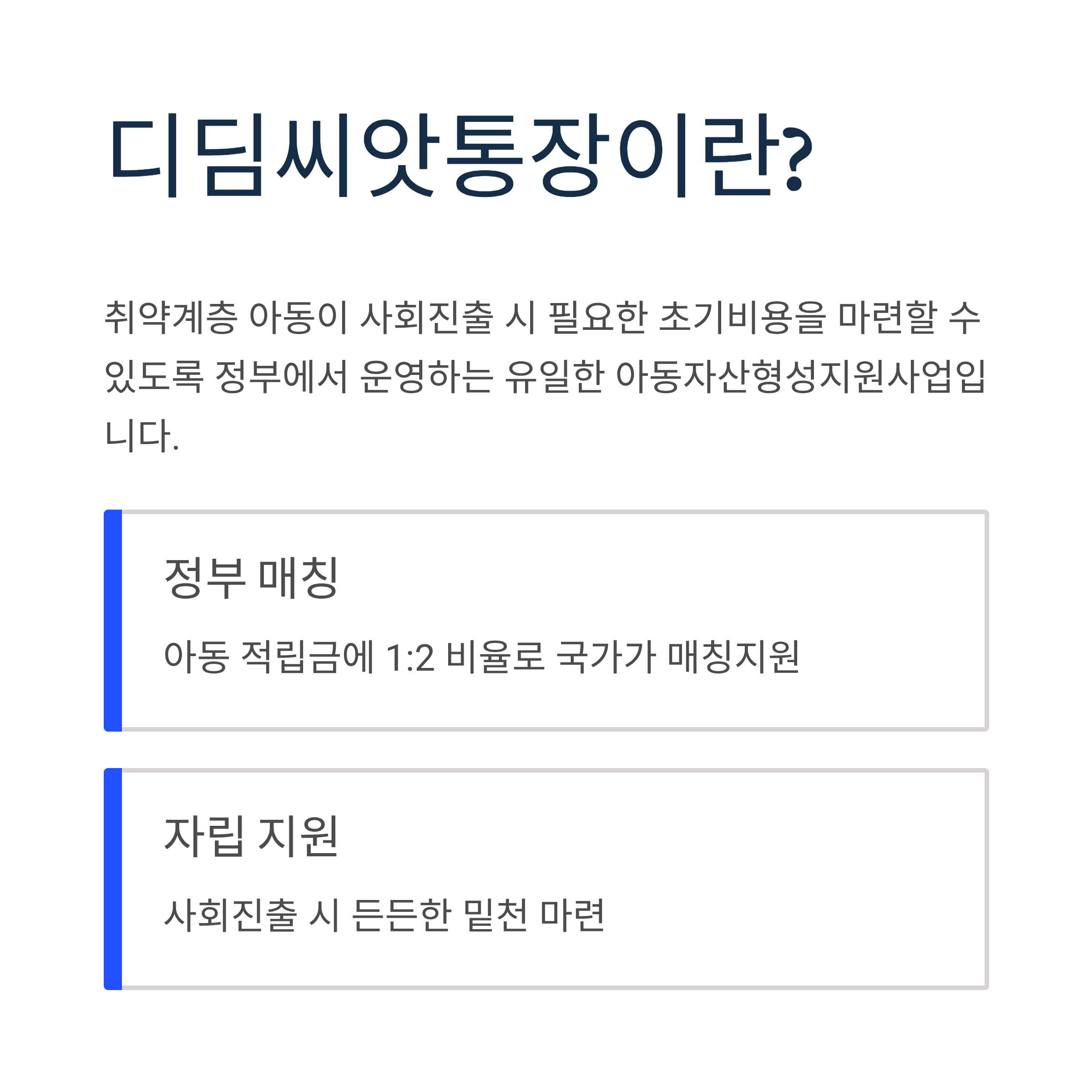디딤씨앗통장은 취약계층 아동들에게 자립의 희망을 심어주는 소중한 제도입니다. 2025년 차상위계층까지 확대된 만큼, 해당 조건에 맞는 가정이라면 반드시 신청을 검토해보시기 바랍니다. 작은 적립으로 시작해 큰 꿈을 키울 수 있는 디딤씨앗통장으로 아이의 미래를 준비하세요.