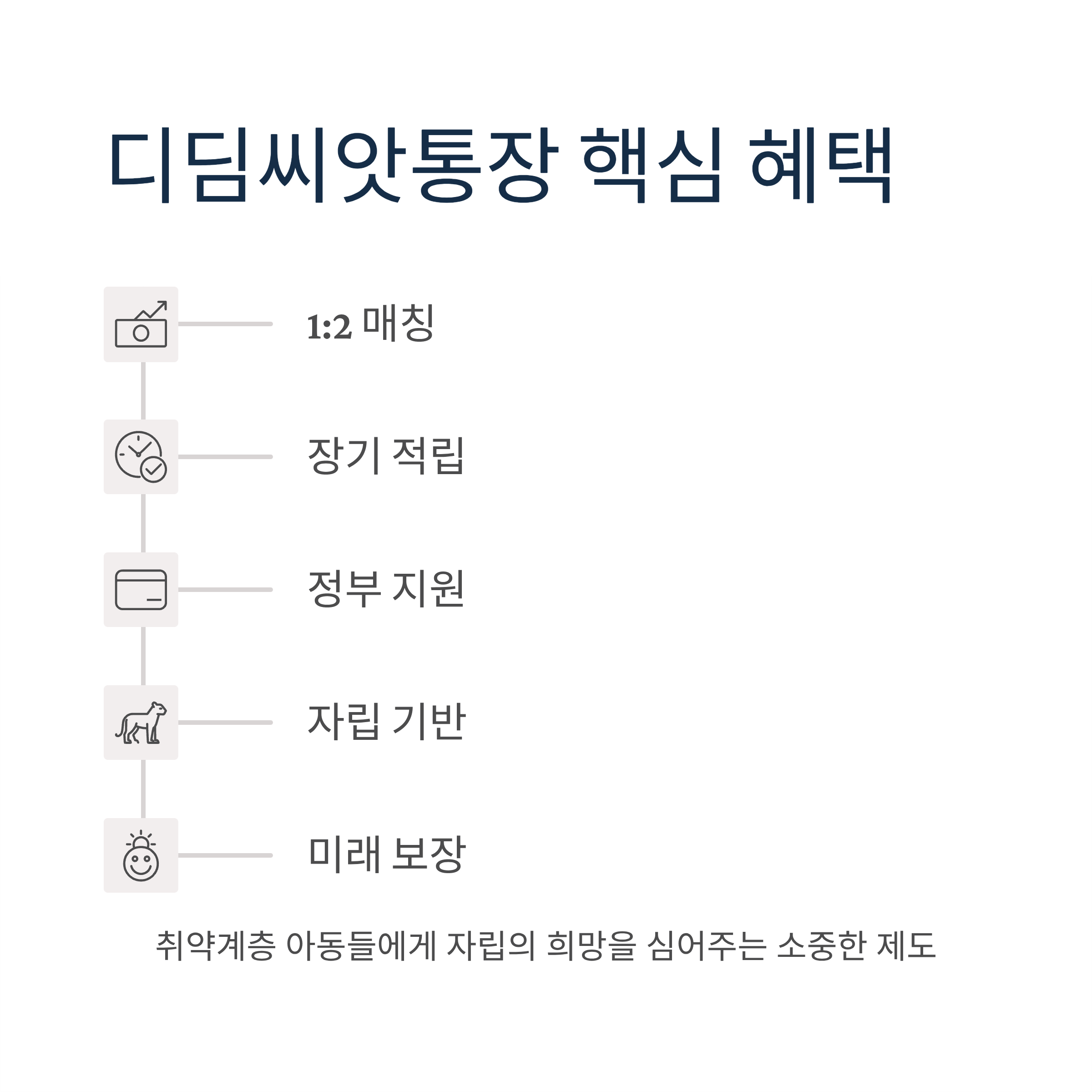 디딤씨앗통장(아동발달지원계좌)은 취약계층 아동이 사회진출 시 필요한 초기비용을 마련할 수 있도록 정부에서 운영하는 유일한 아동자산형성지원사업입니다. 아동이 매월 일정금액을 적립하면 국가(지자체)가 월 10만원 내에서 1:2 비율로 매칭지원하는 획기적인 제도입니다.