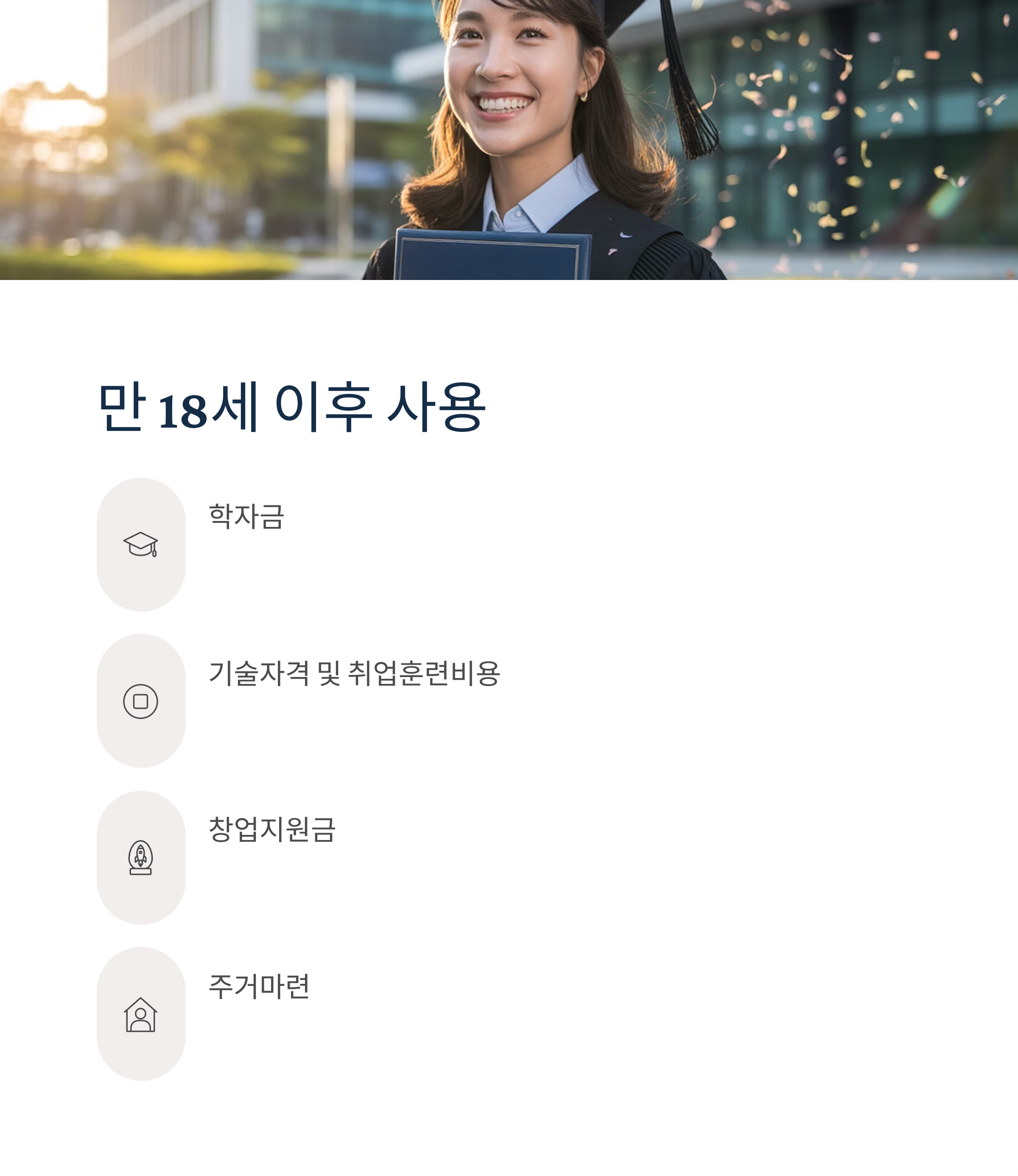 만 18세 이후: 학자금, 기술자격 및 취업훈련비용, 창업지원금, 주거마련 등 자립용도로만 사용 가능