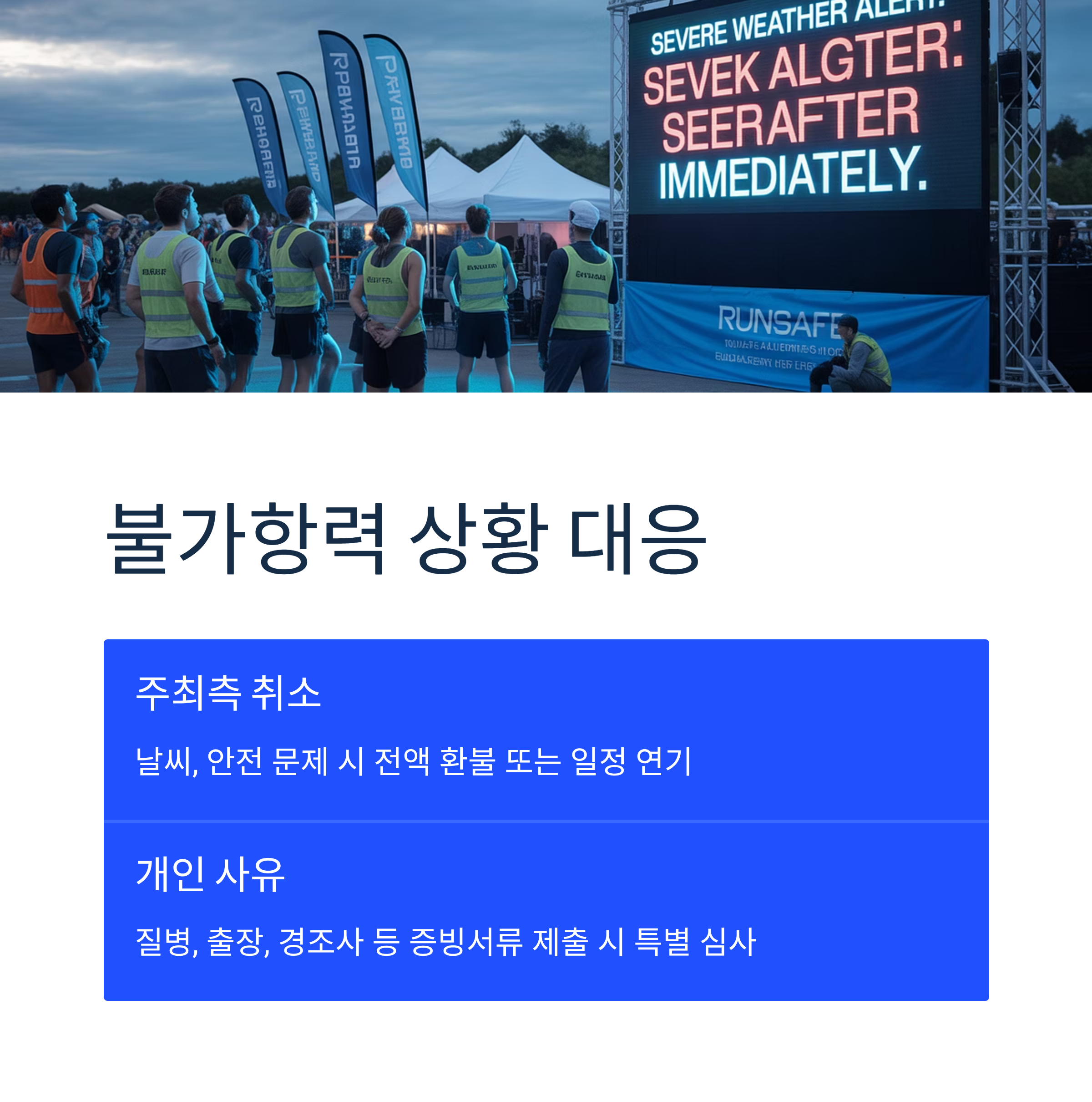 - 일정 연기: 가능한 경우 대체 일정 안내 및 참가권 자동 이월