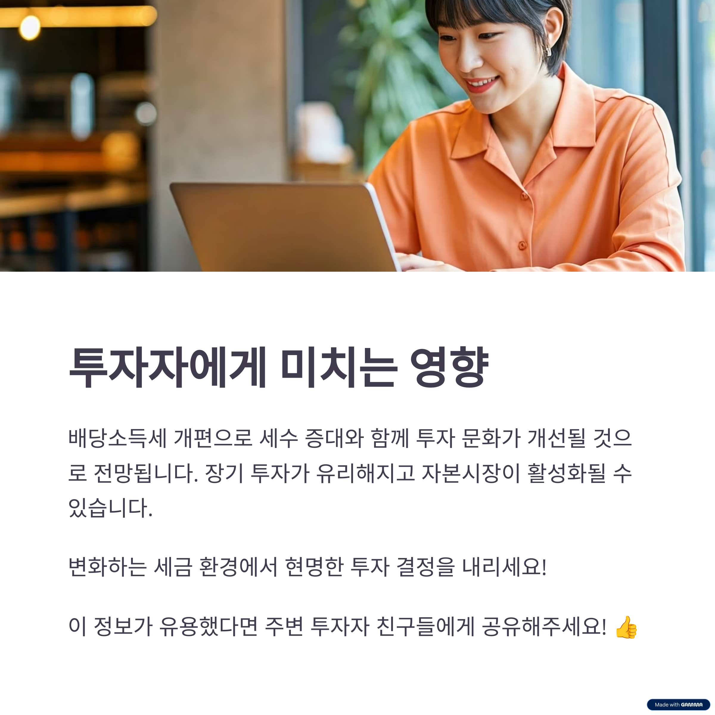 : 배당소득에 대한 세율 인하로 투자자의 세부담이 줄어들어 배당주 투자 매력이 상승할 수 있습니다.