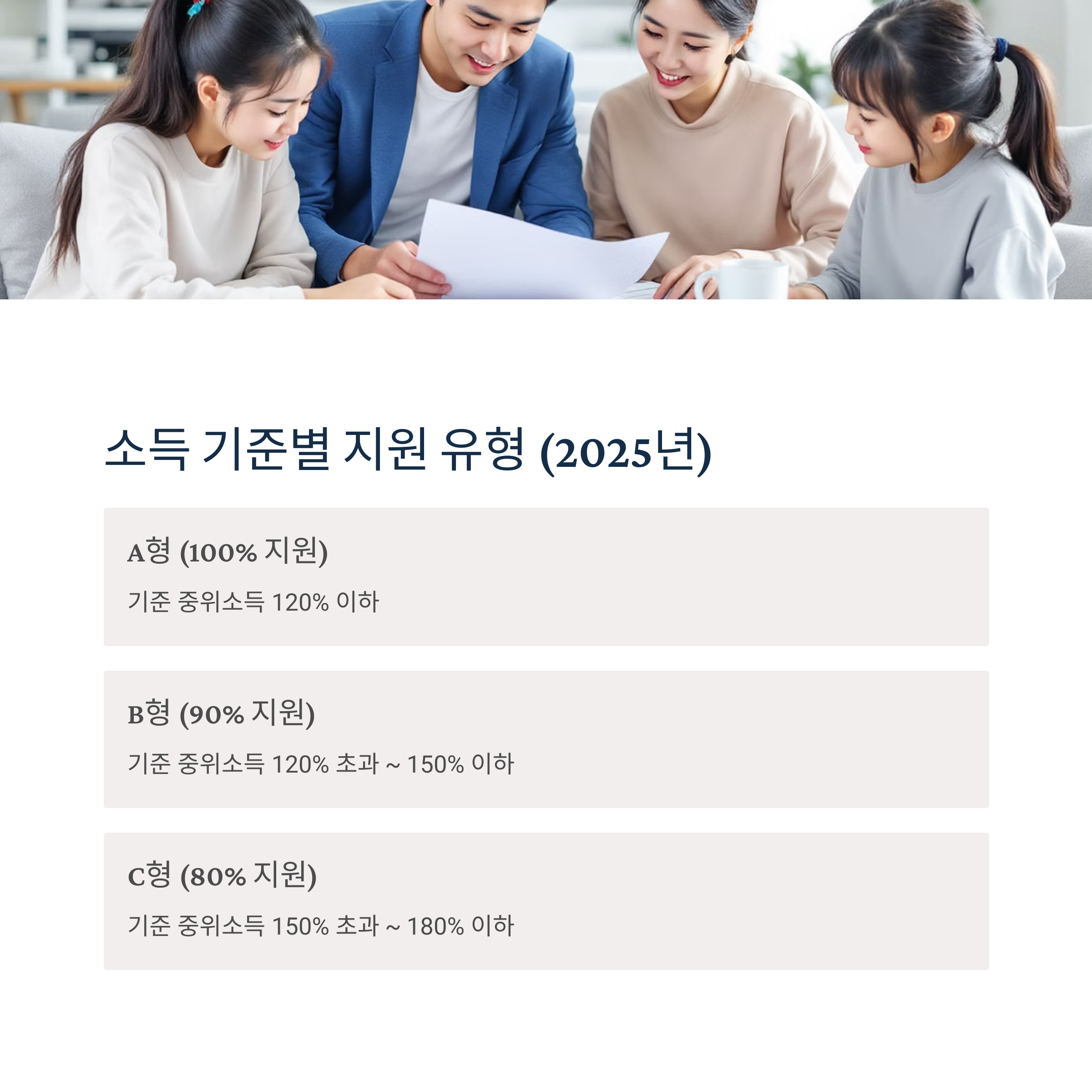 - C형 (80% 지원): 기준 중위소득 150% 초과 ~ 180% 이하