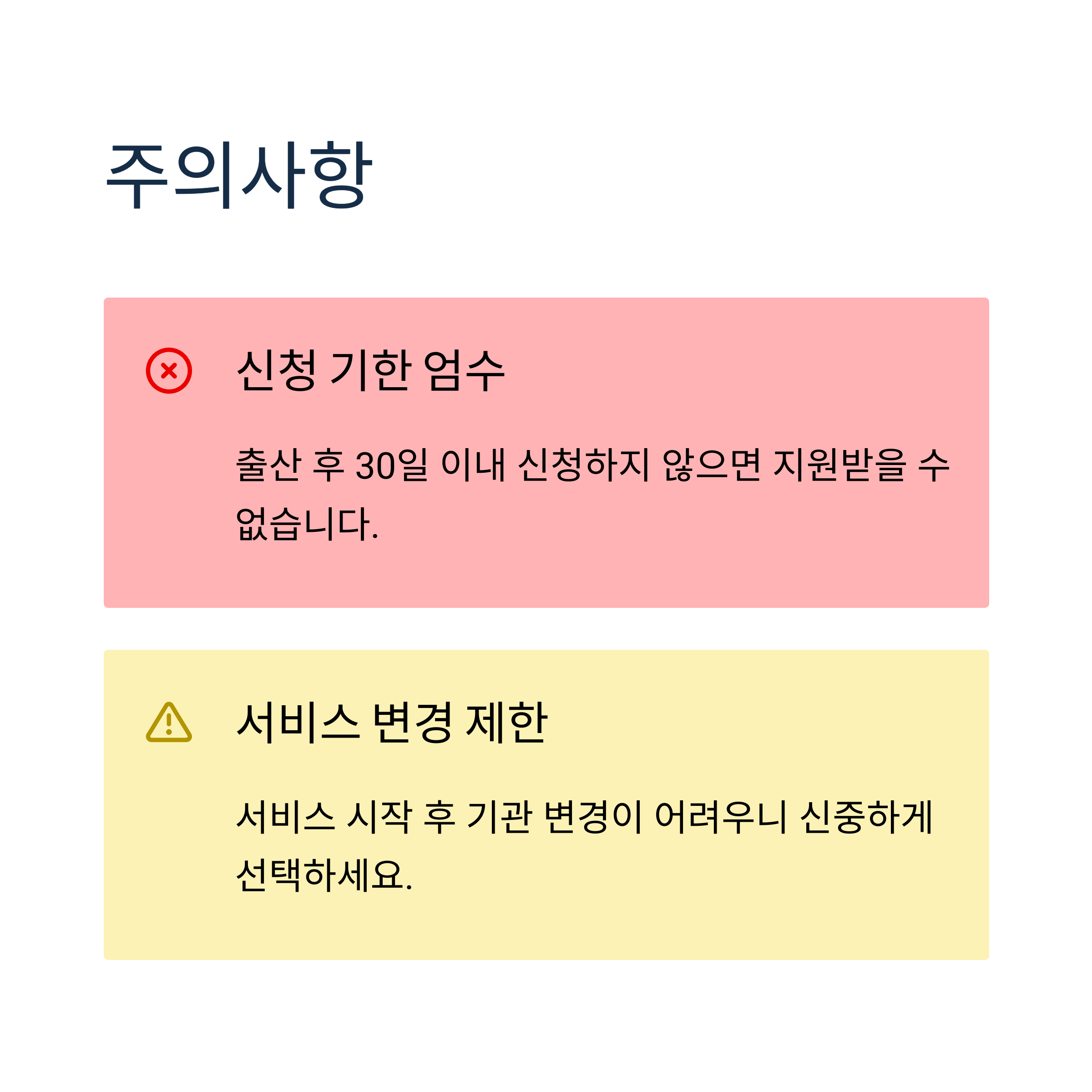 - 신청 기한 엄수: 출산 후 30일 이내 신청하지 않으면 지원받을 수 없습니다.