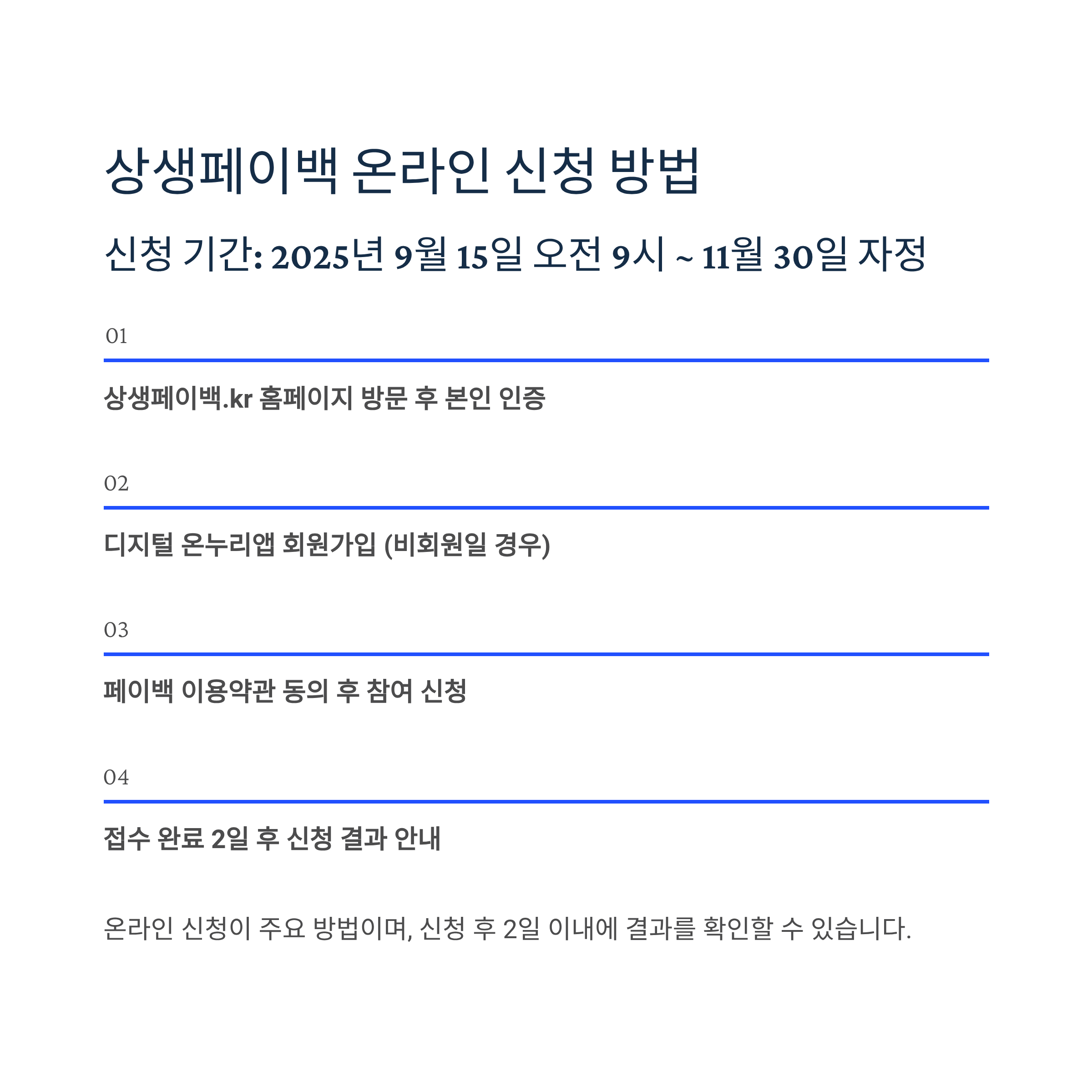 2025년 상생페이백은 단순히 카드를 사용하기만 해도 받을 수 있는 전국민 대상 소비지원 정책입니다. 9월 15일부터 신청이 시작되며, 한 번만 신청하면 3개월간 자동으로 페이백을 받을 수 있습니다.