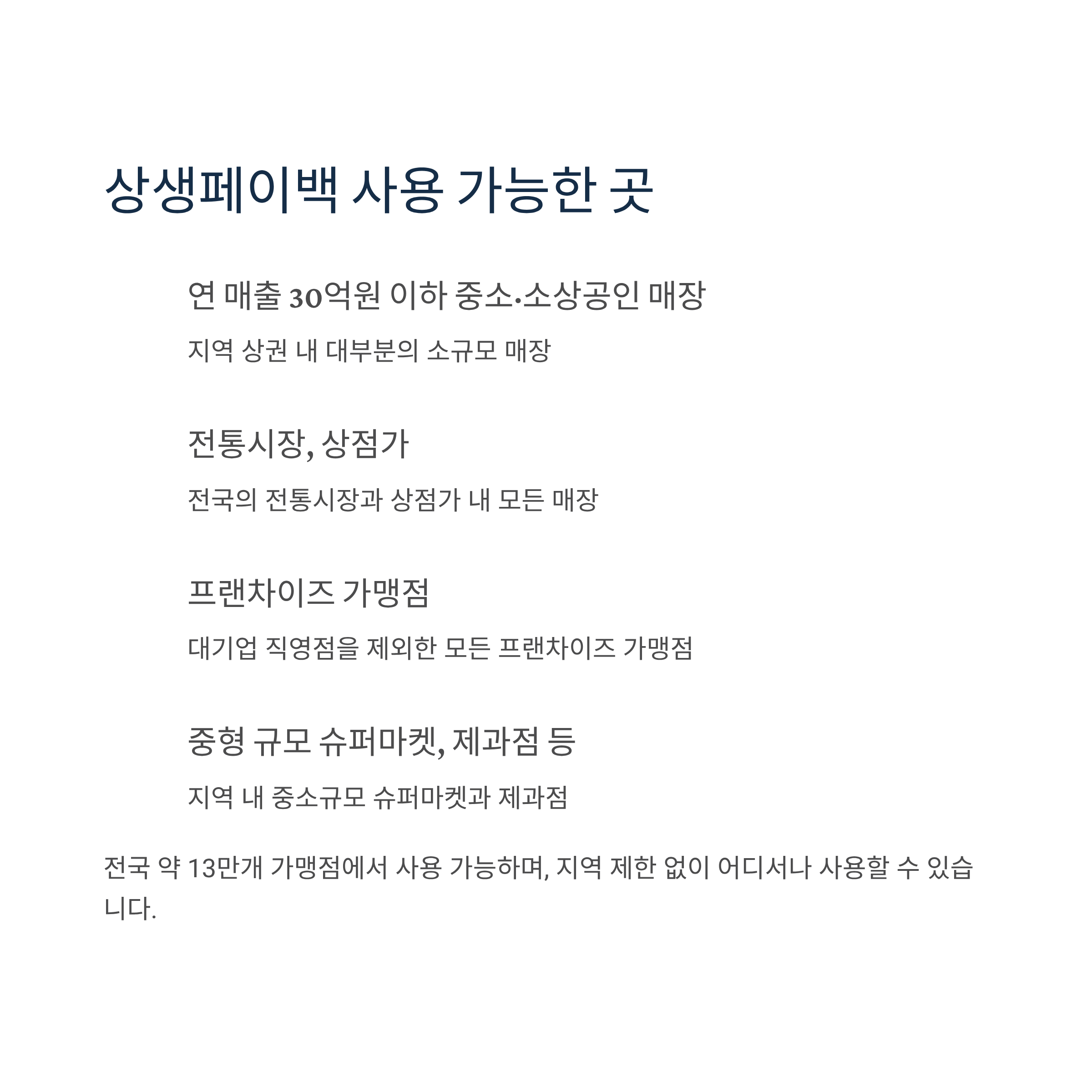 - 사용처 확대: 연 매출 30억원까지 중소·소상공인 매장 포함
