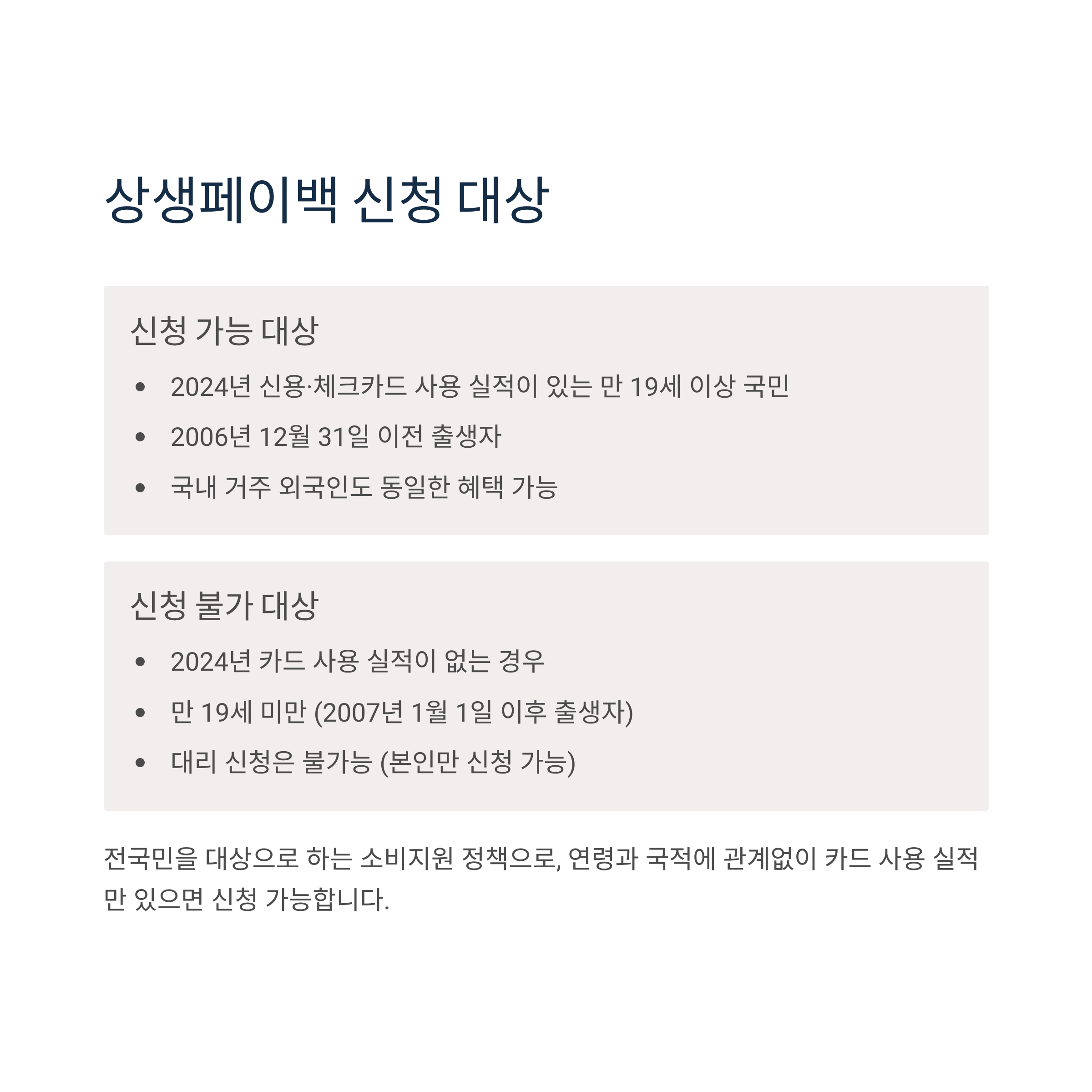 2024년 신용·체크카드 사용 실적이 있는 만 19세 이상 국민 및 외국인이 대상입니다. 구체적으로는 2006년 12월 31일 이전 출생자로, 대한민국 국민뿐만 아니라 국내 거주 외국인도 동일한 혜택을 받을 수 있습니다.