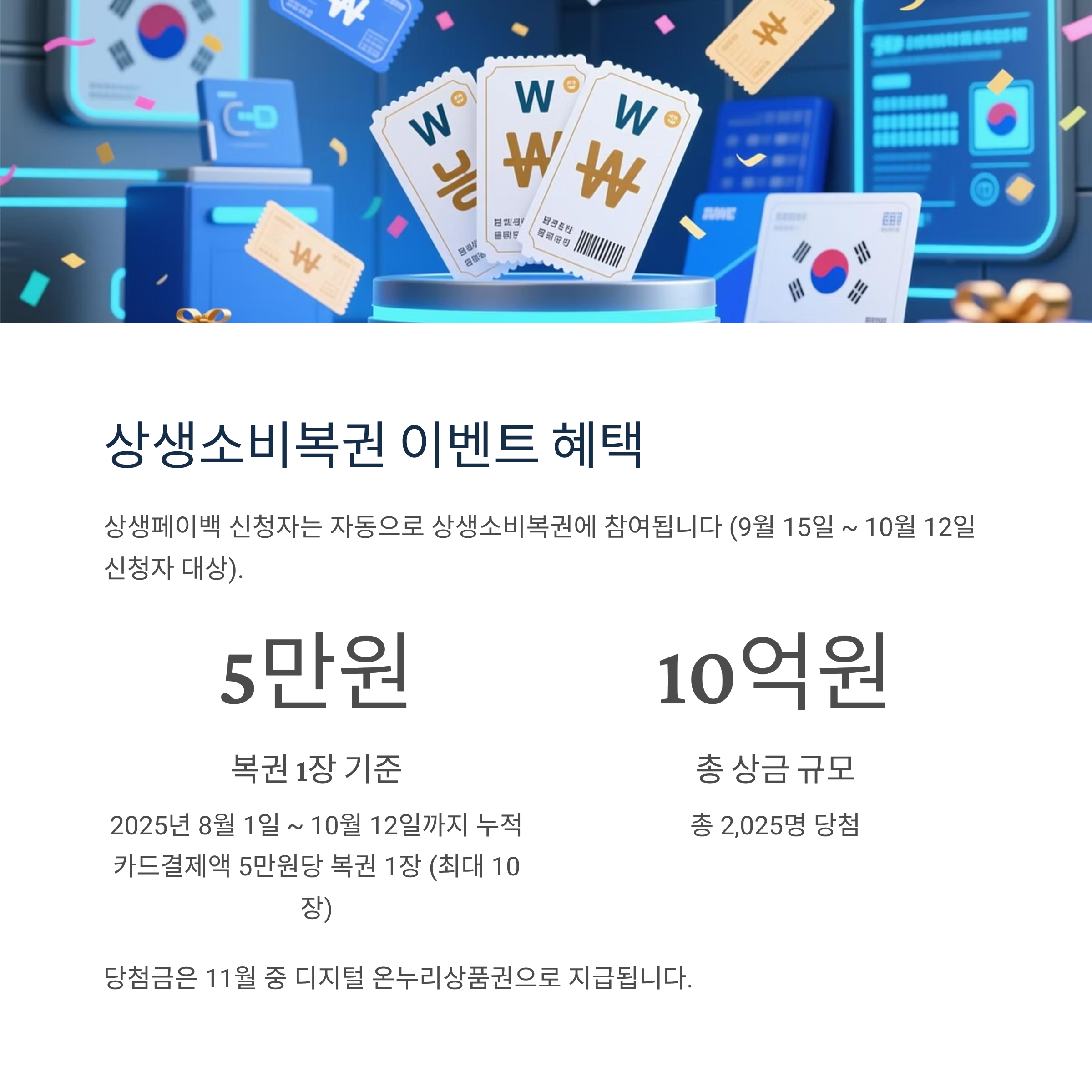 2025년 8월 1일 ~ 10월 12일까지 누적 카드결제액 5만원당 복권 1장 (최대 10장).