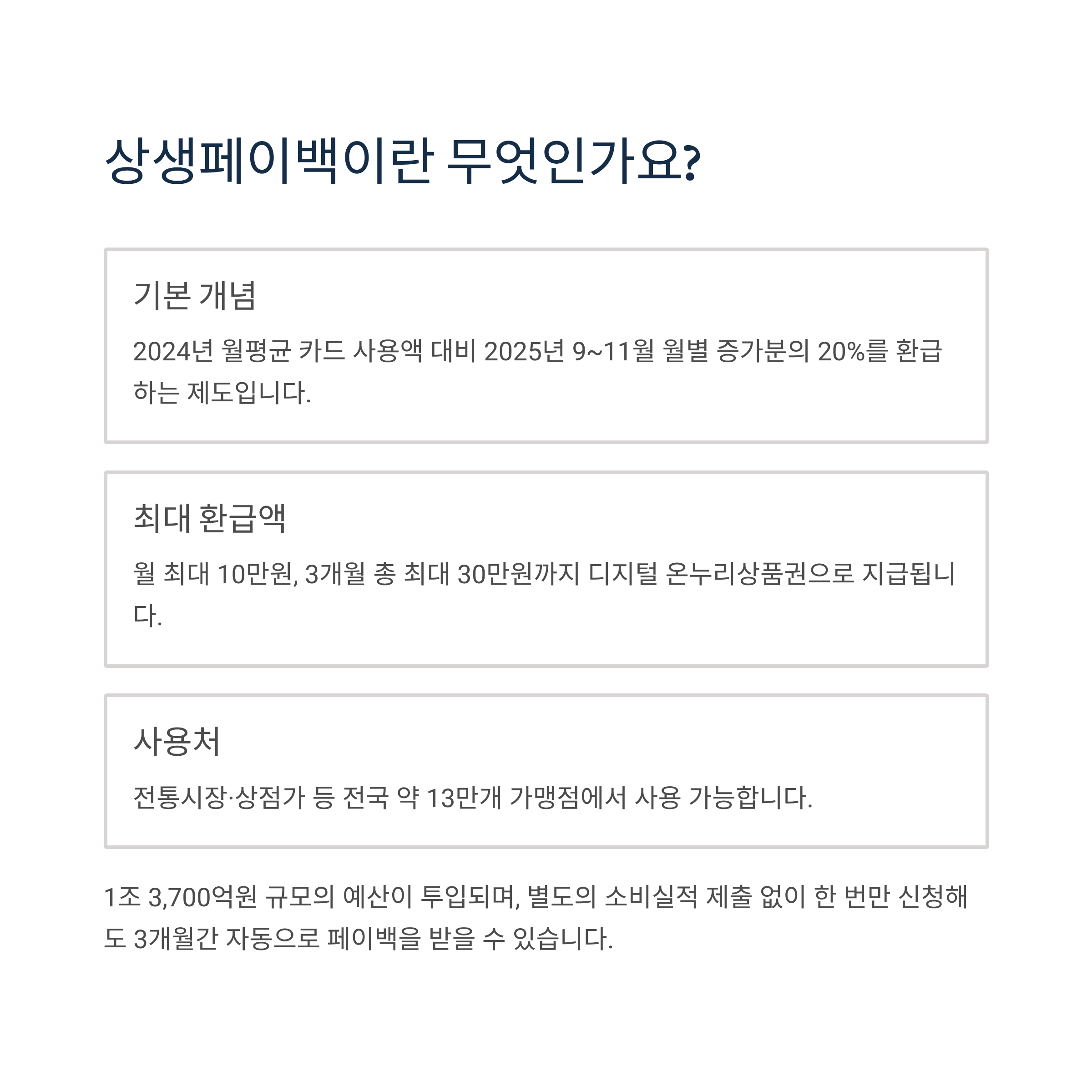 상생페이백은 2024년 월평균 카드 사용액 대비 2025년 9~11월 월별 증가분의 20%를 환급하는 제도입니다. 월 최대 10만원, 3개월 총 최대 30만원까지 디지털 온누리상품권으로 지급되며, 전통시장·상점가 등 전국 약 13만개 가맹점에서 사용할 수 있습니다.