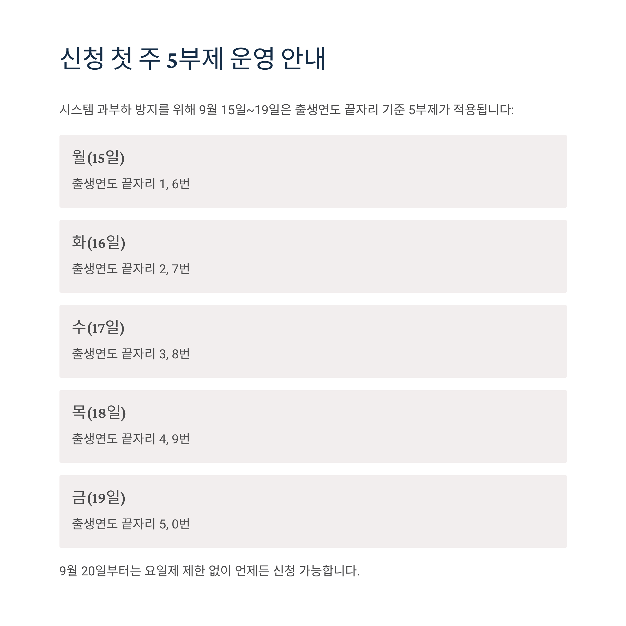시스템 과부하 방지를 위해 9월 15일~19일은 출생연도 끝자리 기준 5부제가 적용됩니다: