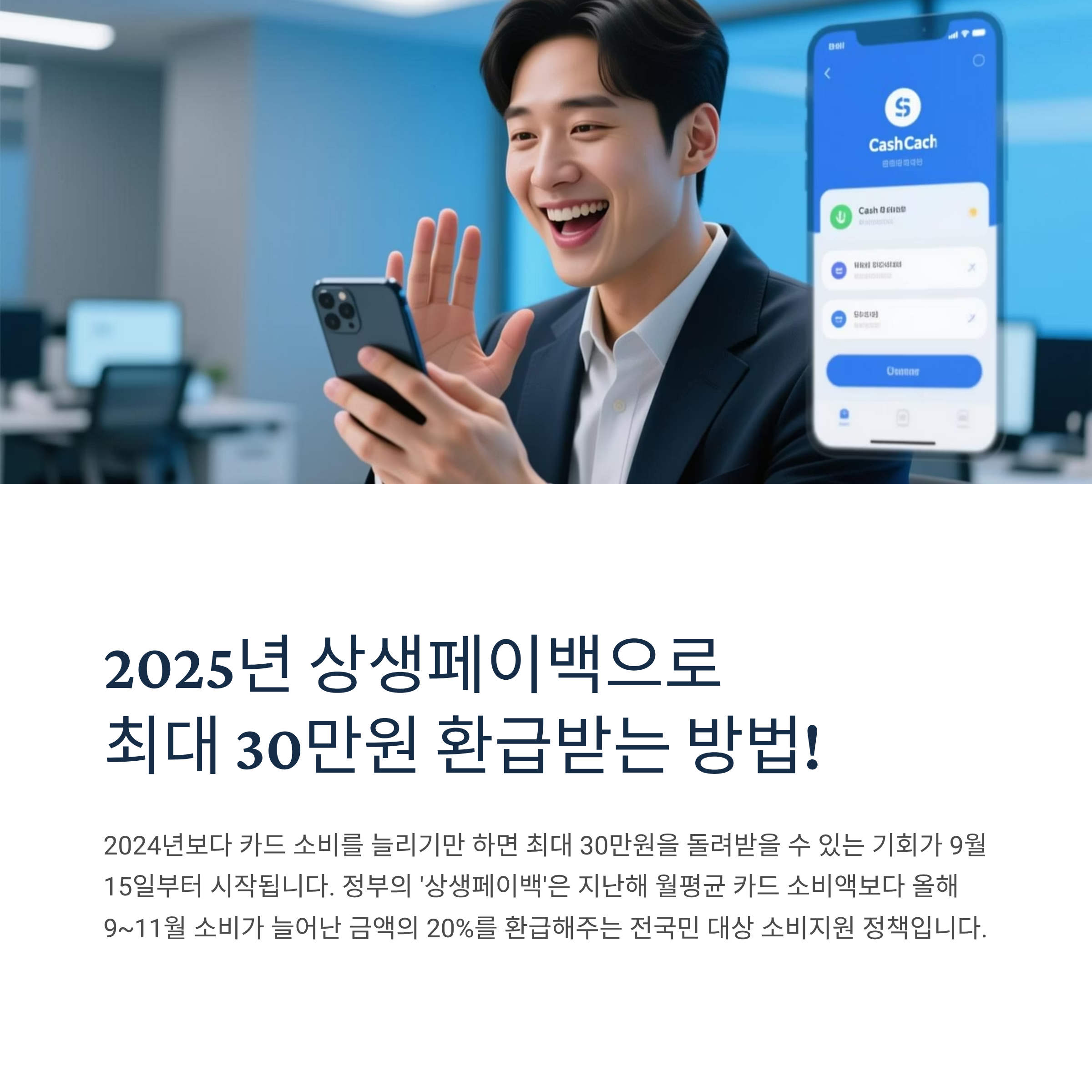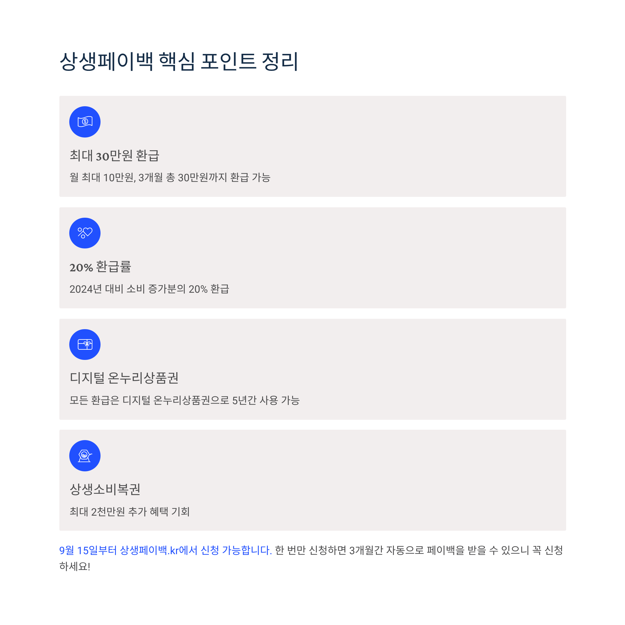 2024년보다 카드 소비를 늘리기만 하면 최대 30만원을 돌려받을 수 있는 기회가 드디어 시작됩니다! 정부가 9월 15일부터 시행하는 '상생페이백'은 지난해 월평균 카드 소비액보다 올해 9~11월 소비가 늘어난 금액의 20%를 환급해주는 전국민 대상 소비지원 정책입니다. 1조 3,700억원 규모의 예산이 투입되며, 별도의 소비실적 제출 없이 한 번만 신청해도 3개월간 자동으로 페이백을 받을 수 있습니다.