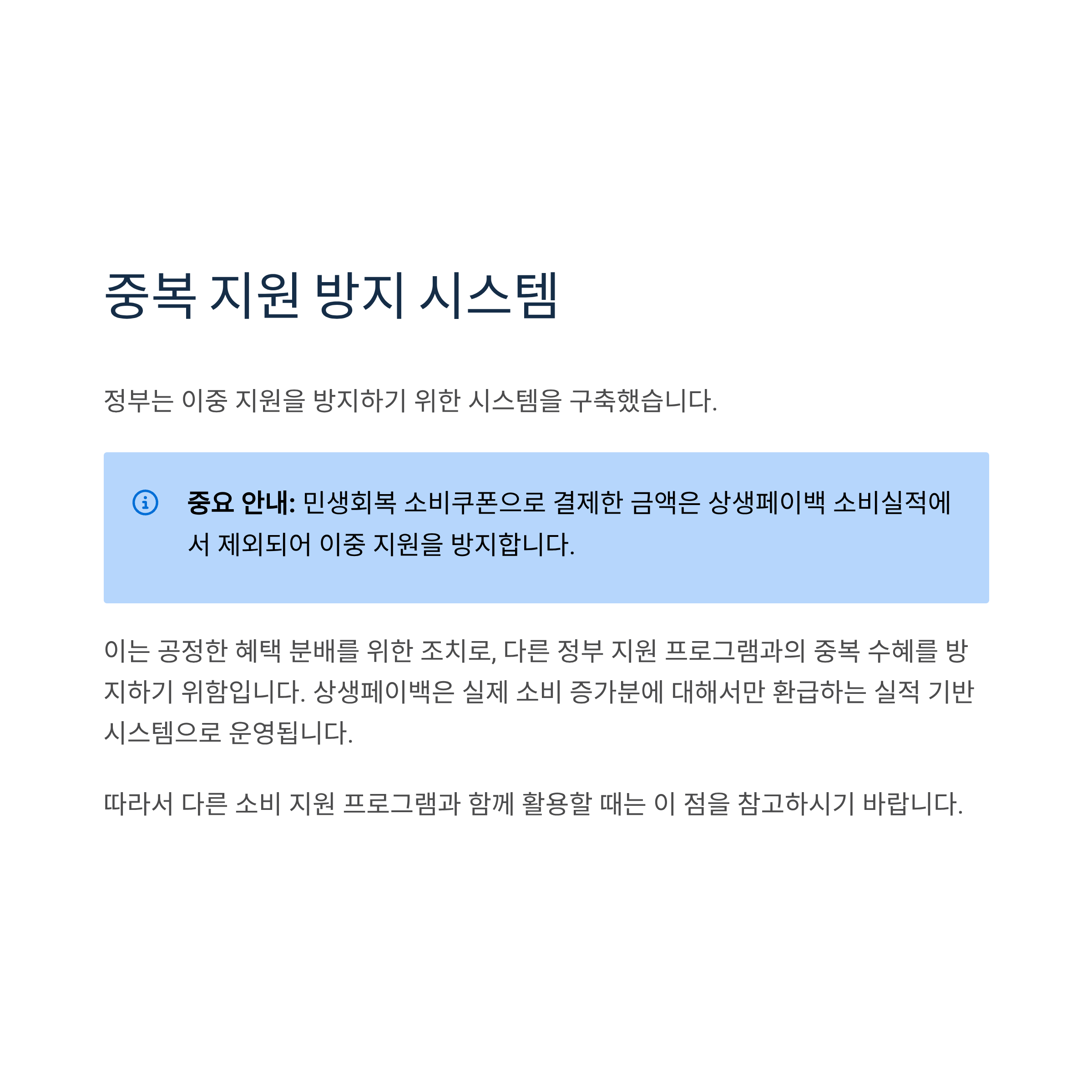 민생회복 소비쿠폰으로 결제한 금액은 상생페이백 소비실적에서 제외되어 이중 지원을 방지합니다.
