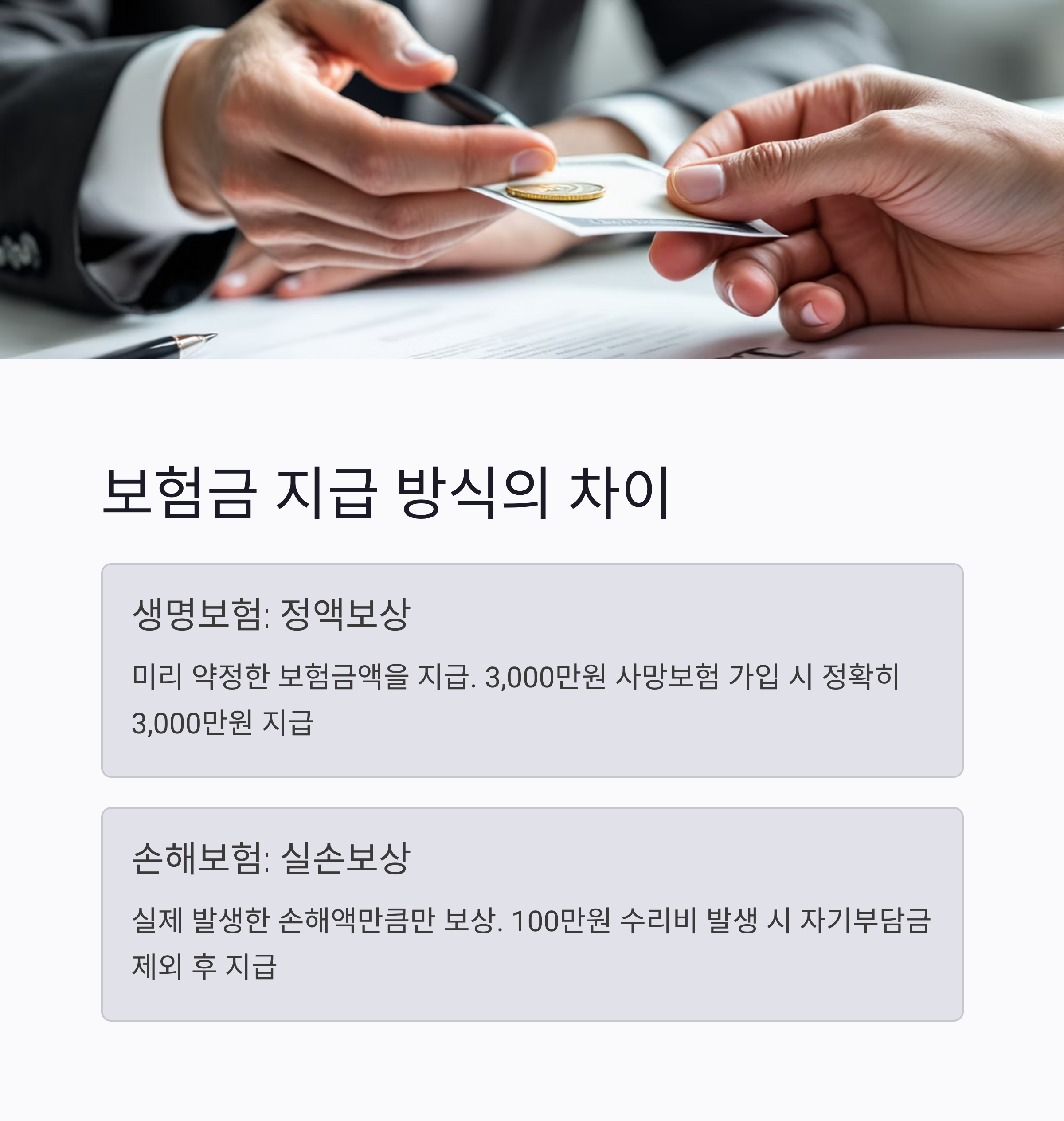 생명보험은 정액보상 방식입니다. 미리 약정한 보험금액을 지급하죠. 예를 들어 3,000만원 사망보험금으로 가입했다면, 사망 시 정확히 3,000만원을 받습니다.