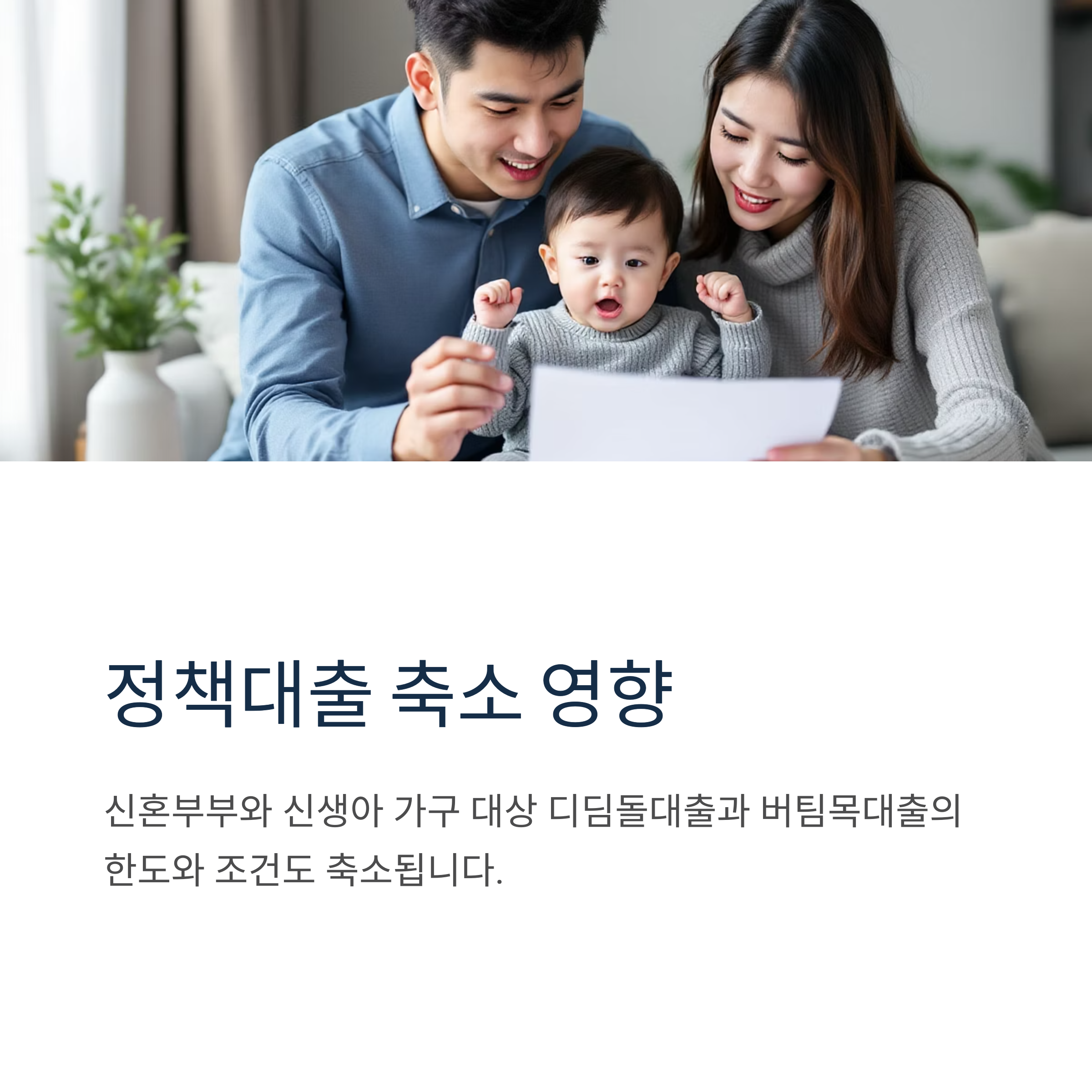 신혼부부와 신생아 가구를 대상으로 한 디딤돌대출과 버팀목대출의 한도와 조건도 축소됩니다. 이는 정부가 전체적인 가계대출 총량을 줄이겠다는 의지를 보여주는 조치입니다.