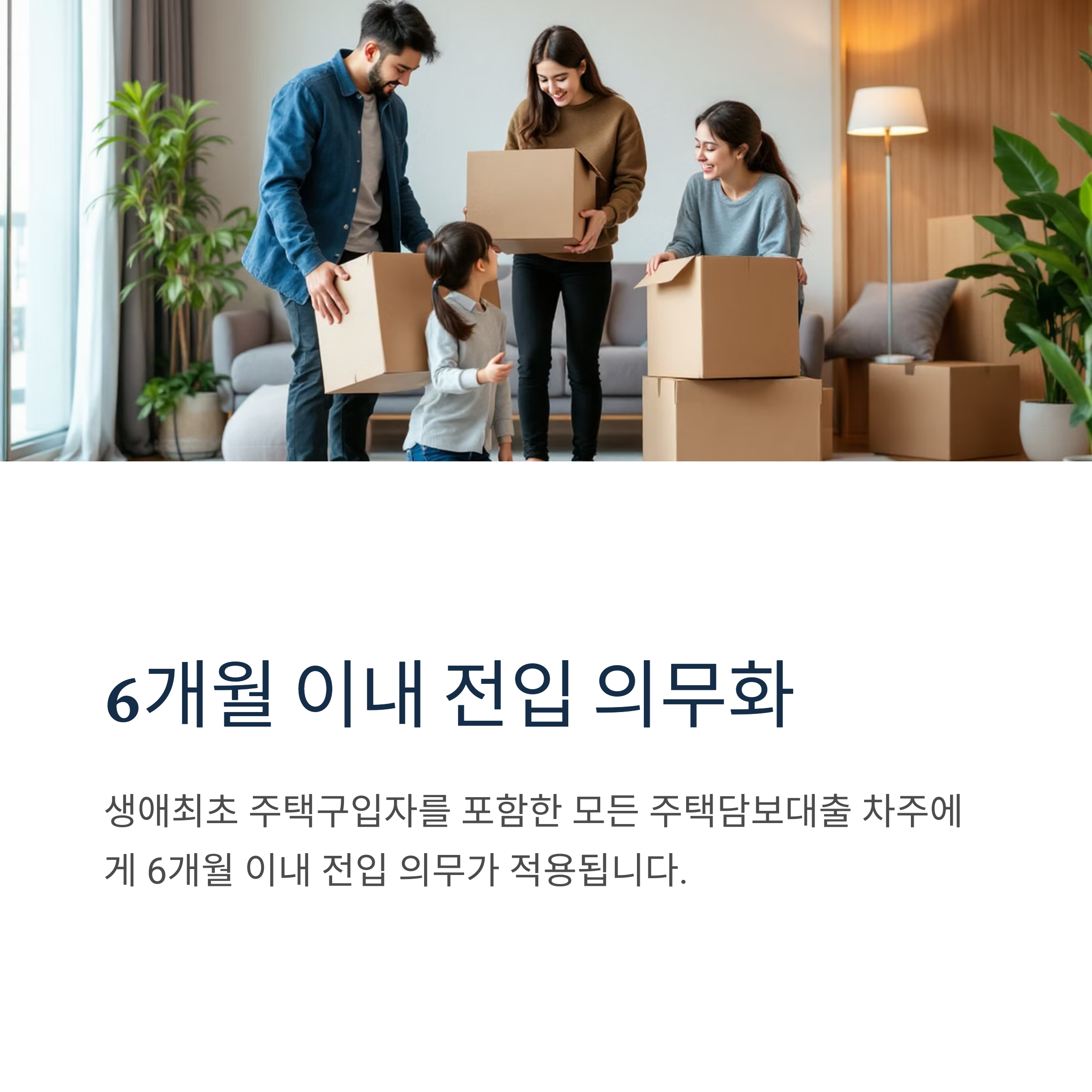 생애최초 주택구입자를 포함해 주택담보대출을 받는 모든 차주에게 6개월 이내 전입 의무가 적용됩니다.
