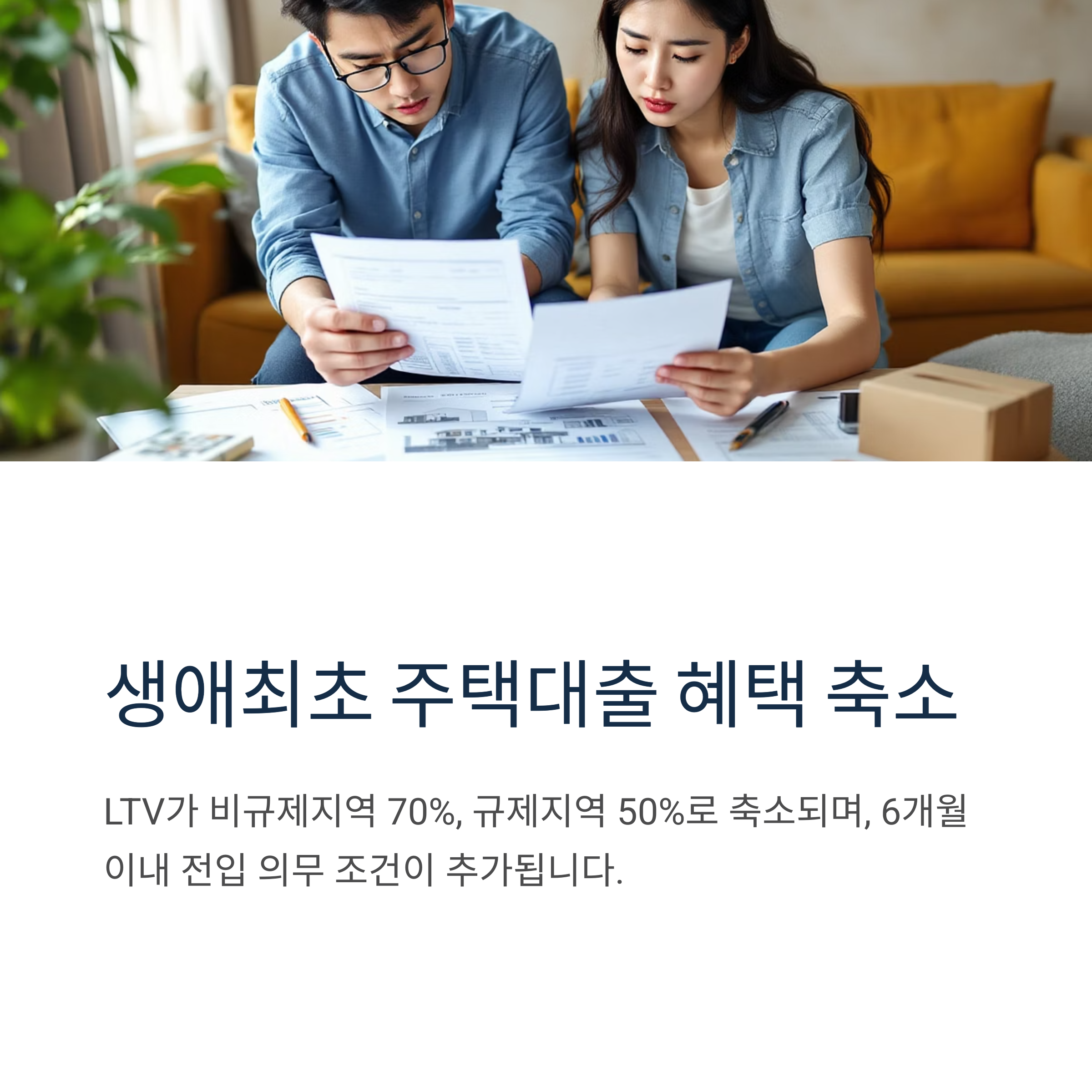 2025년 7월부터는 생애최초 주택구입자에 대한 혜택도 크게 줄어듭니다. LTV(주택담보인정비율)가 비규제지역 70%, 규제지역 50%로 축소되며, 6개월 이내 전입 의무 조건도 추가됩니다.