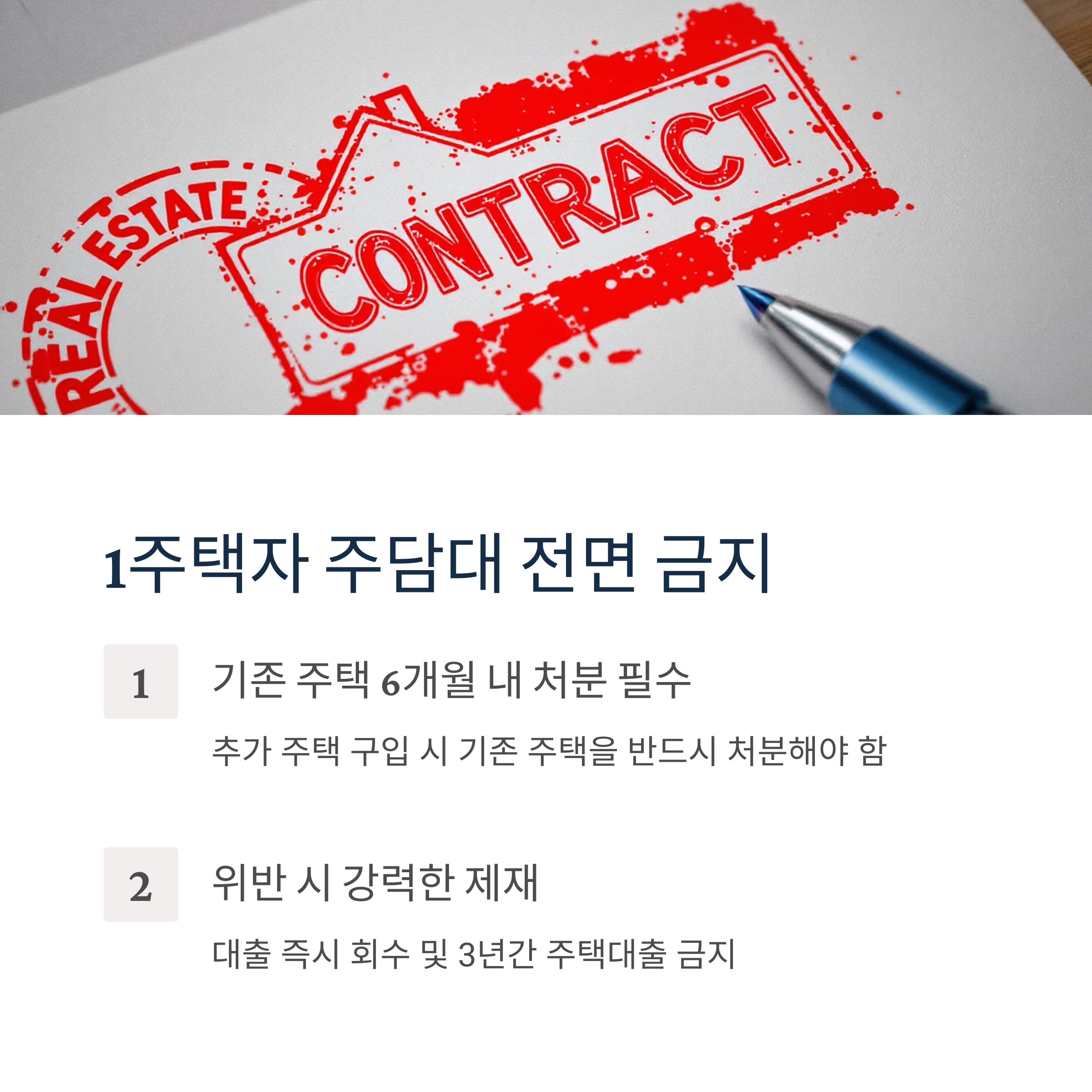 기존 주택을 보유한 1주택자가 추가로 주택담보대출을 받으려면 기존 주택을 6개월 이내 처분해야 합니다. 이를 위반할 경우 대출 즉시 회수와 3년간 주택대출 금지라는 강력한 제재가 따릅니다.