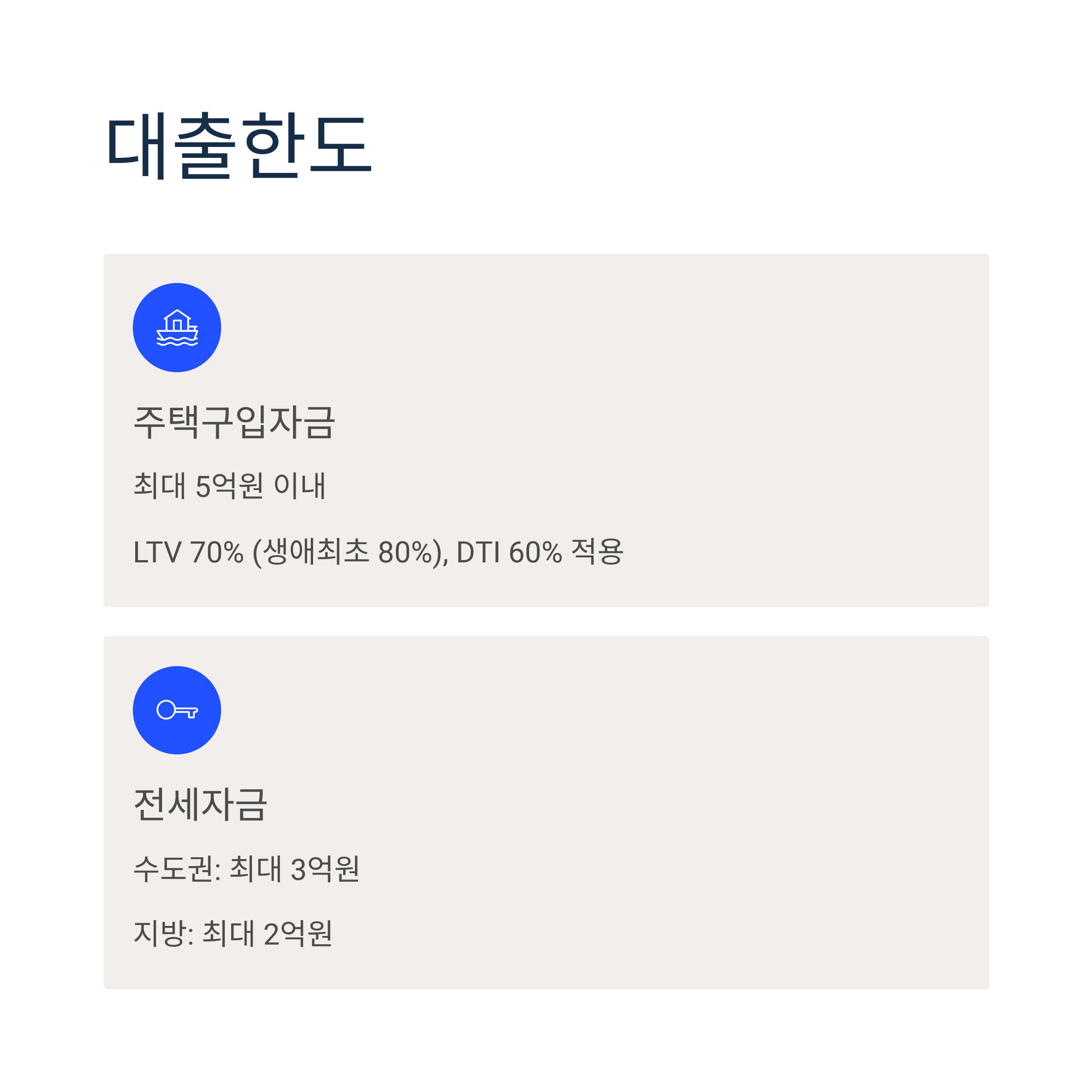 | 주택구입자금 | 최대 5억원 이내 | LTV 70% (생애최초 80%), DTI 60% DSR 규제 미적용 |