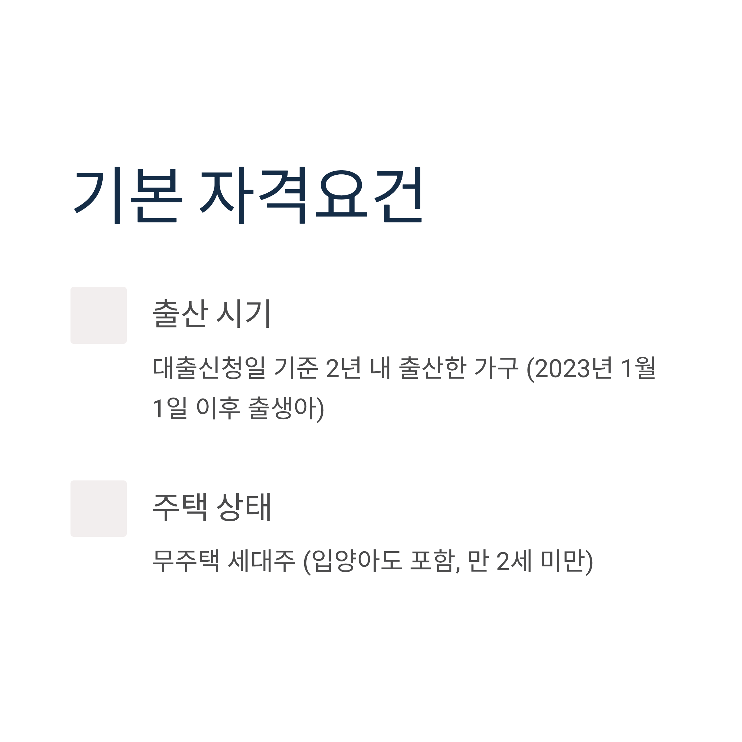 대출신청일 기준 2년 내 출산한 무주택 세대주가 기본 조건입니다. 2023년 1월 1일 이후 출생아부터 적용되며, 입양아도 포함됩니다(만 2세 미만).