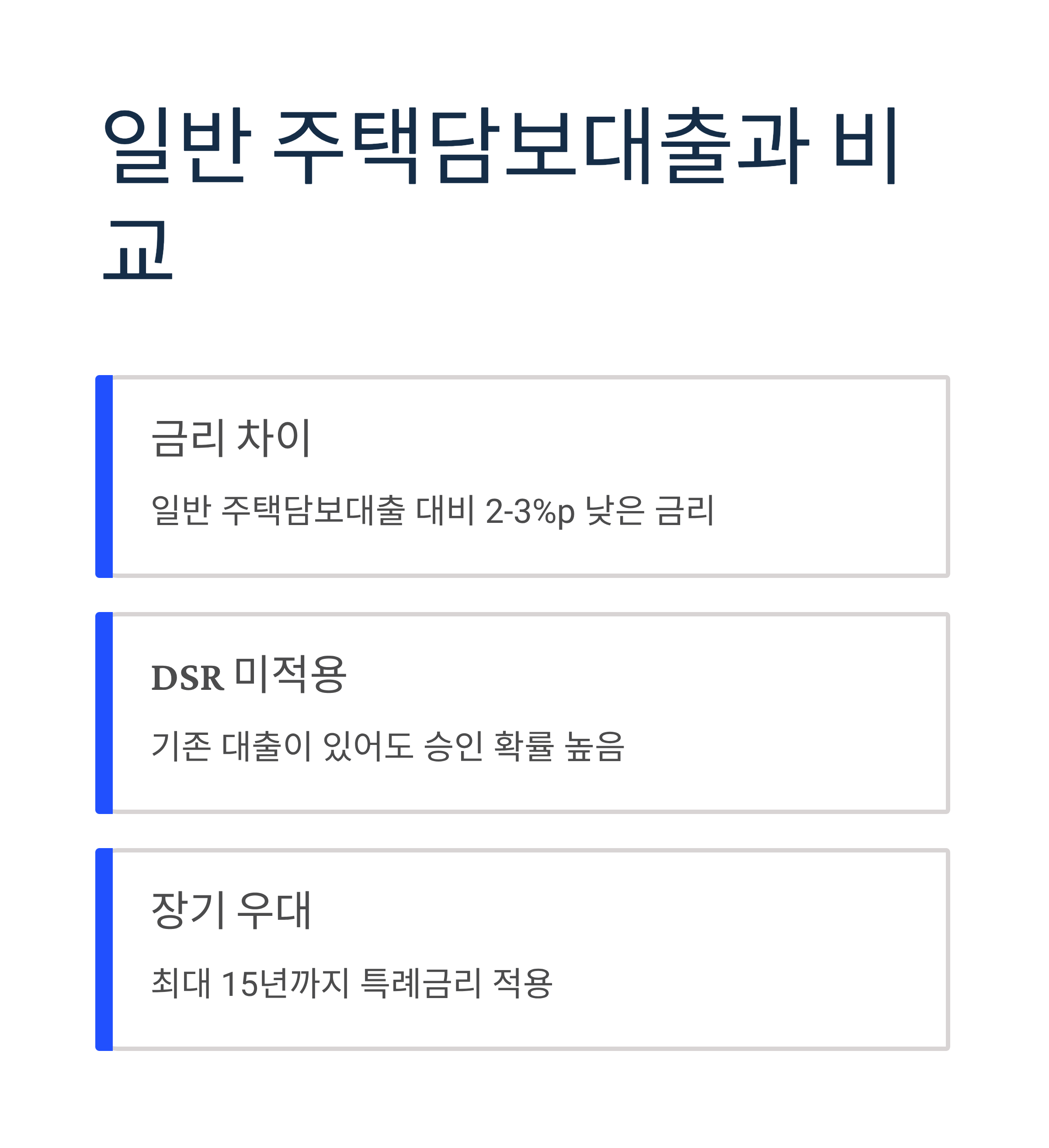- ✅ 금리 차이: 일반 주택담보대출 대비 2-3%p 낮은 금리