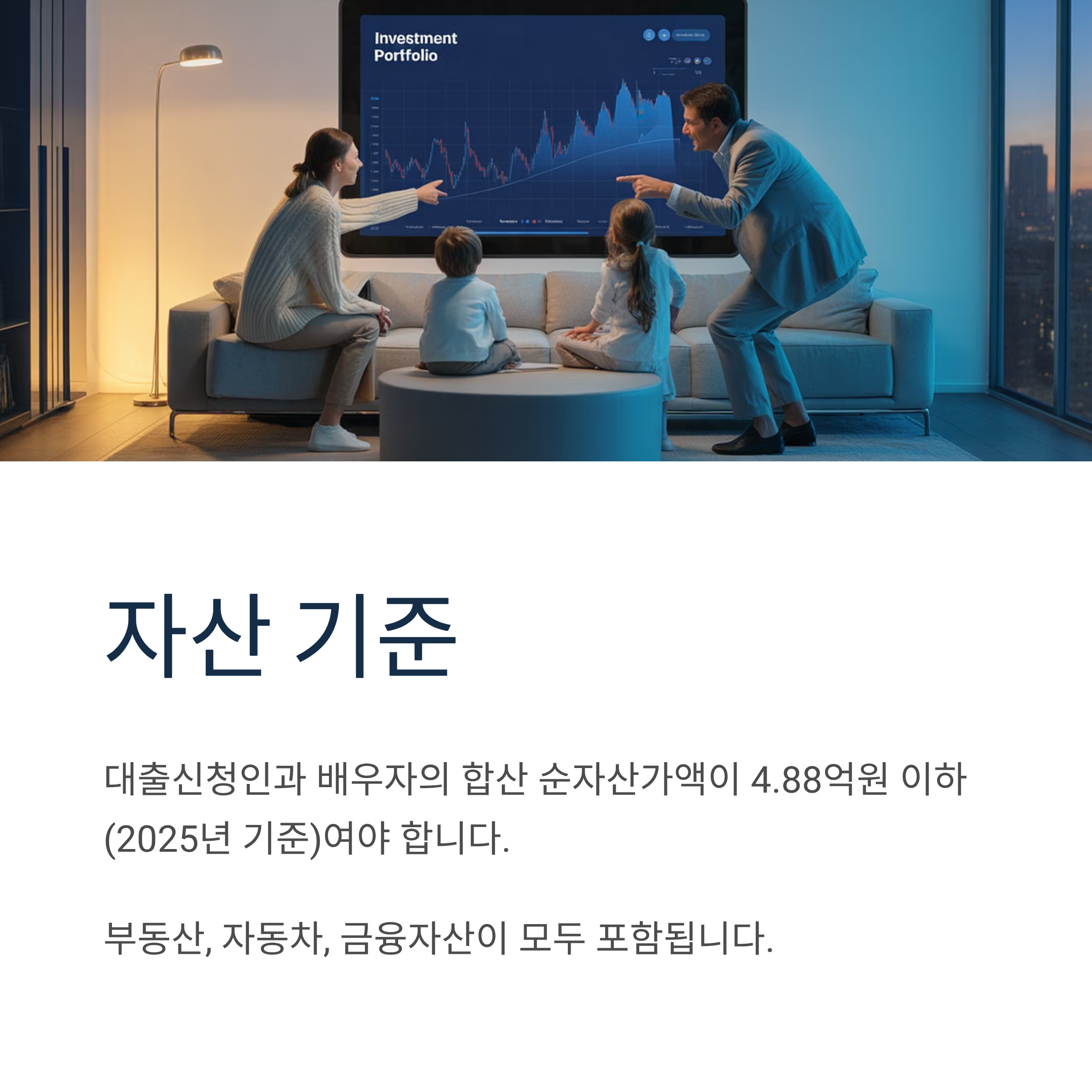 대출신청인과 배우자의 합산 순자산가액이 4.88억원 이하(2025년 기준)여야 합니다. 여기에는 부동산, 자동차, 금융자산이 모두 포함됩니다.